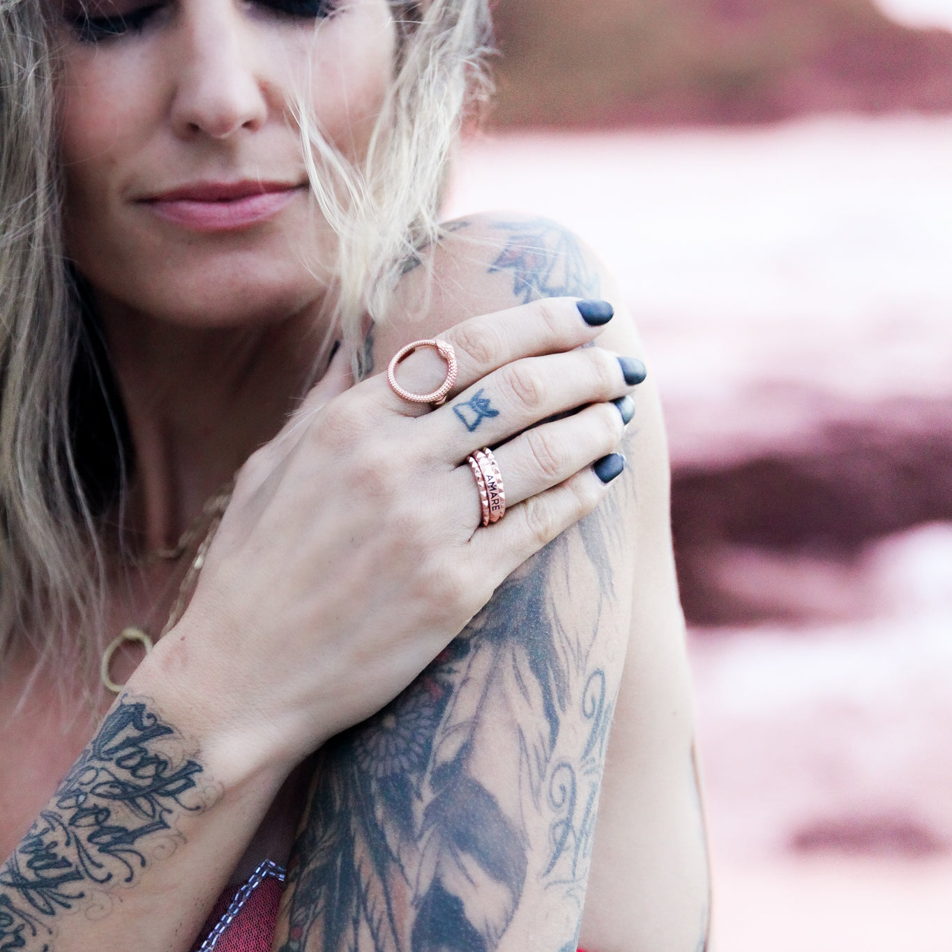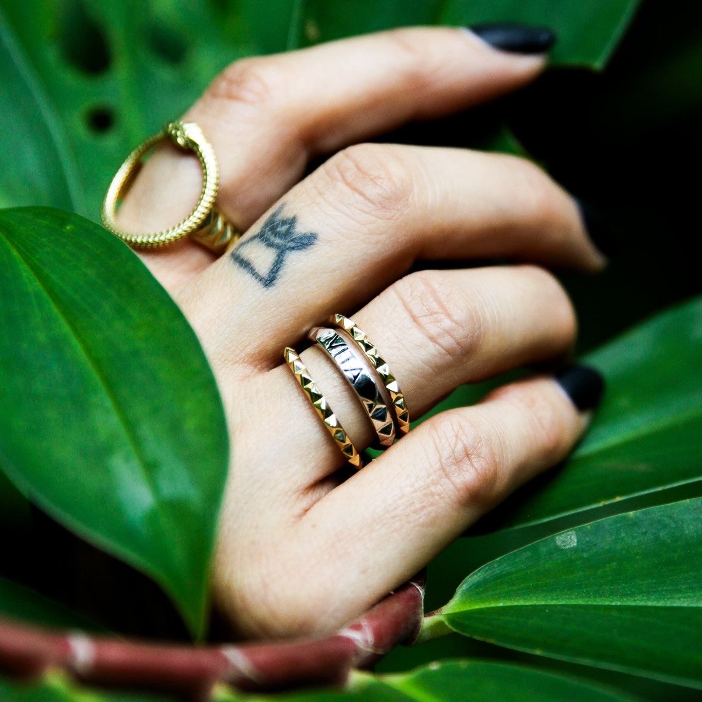 Discover the Love Language Ring collection. Handcrafted in LA with recycled gold and enamel, these rings are a timeless expression of love, peace, courage, and more. Custom made to order.