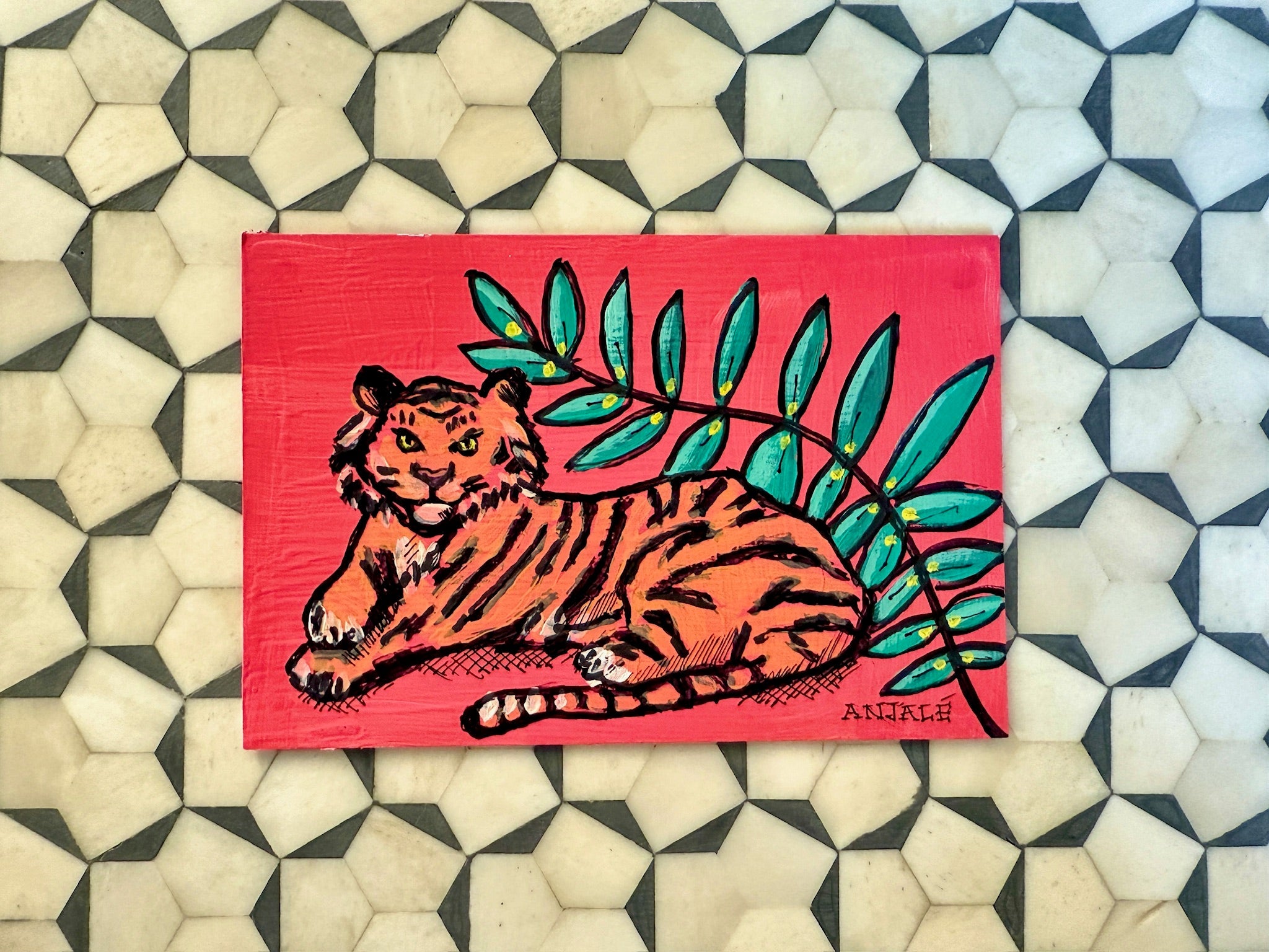 Hand painted in the signature flamingo pink as a base, on the reserve of the 'Temptation' solo show postcards this multi media painting uses sharpie, paint pen and gouache.