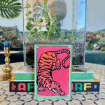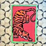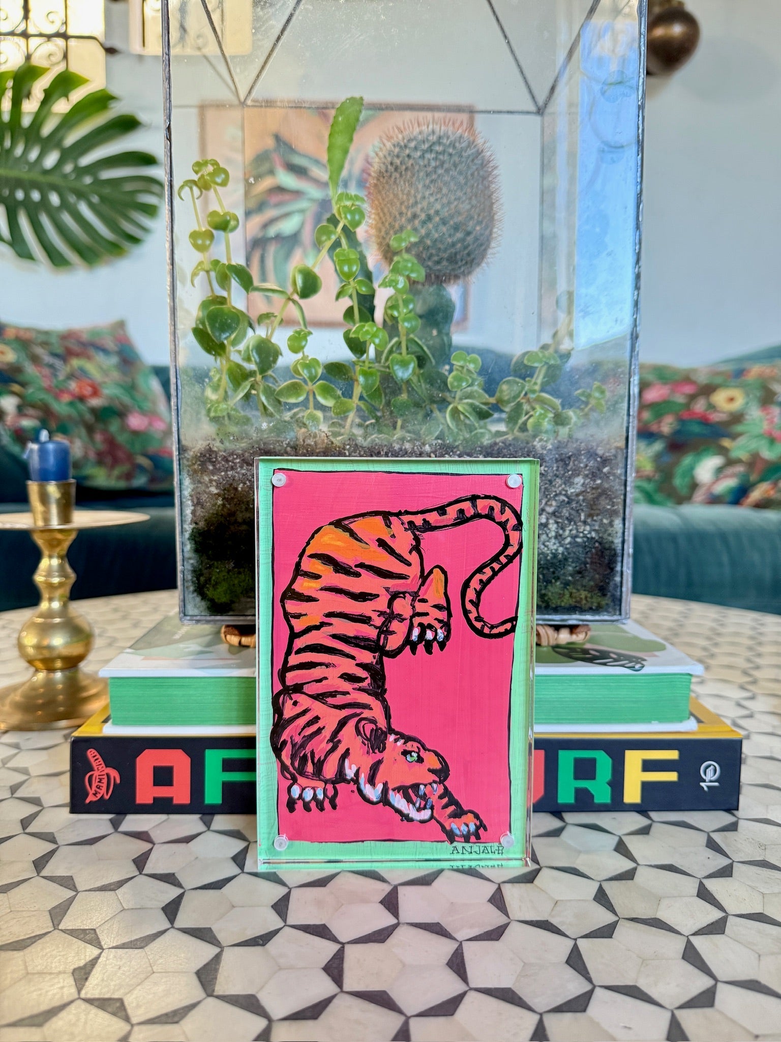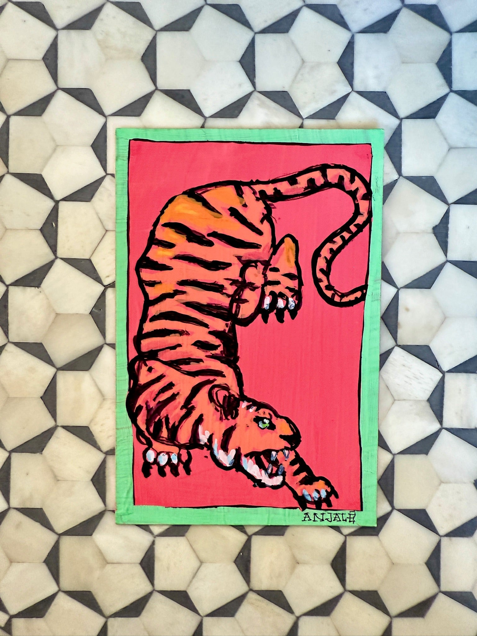 Hand painted in the signature flamingo pink as a base, on the reserve of the 'Temptation' solo show postcards this multi media painting uses sharpie, paint pen and gouache.