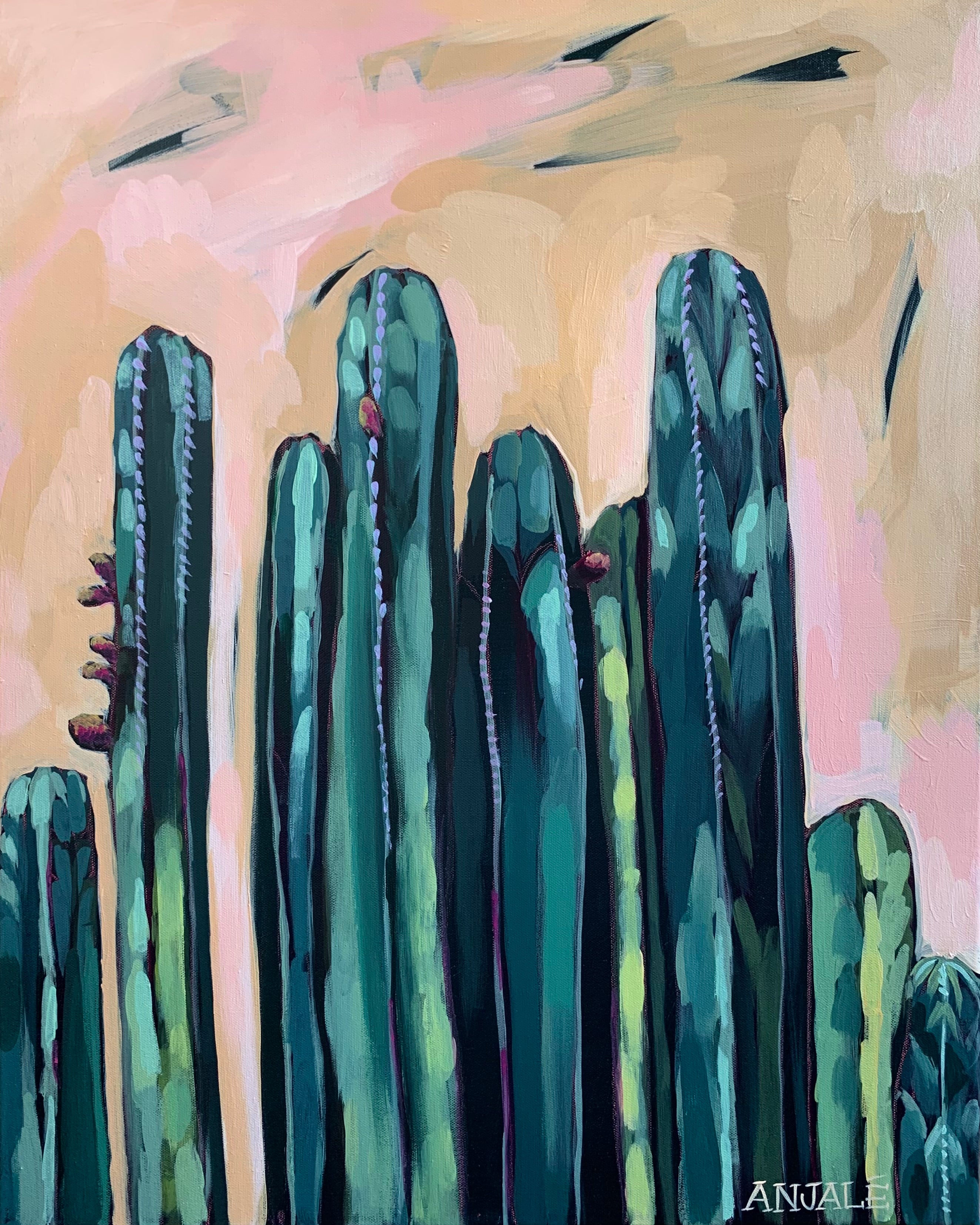 This piece is part of the Made in LA series, inspired by the canyon Anjalé called home and birds of paradise growing outside her grandmother’s bedroom window. It’s about the cacti and yucca trees dotting the LA mountains and the sharp blades of grass her little brother would pluck to make lizard traps in the summertime. She was made in LA, and so were these paintings.
