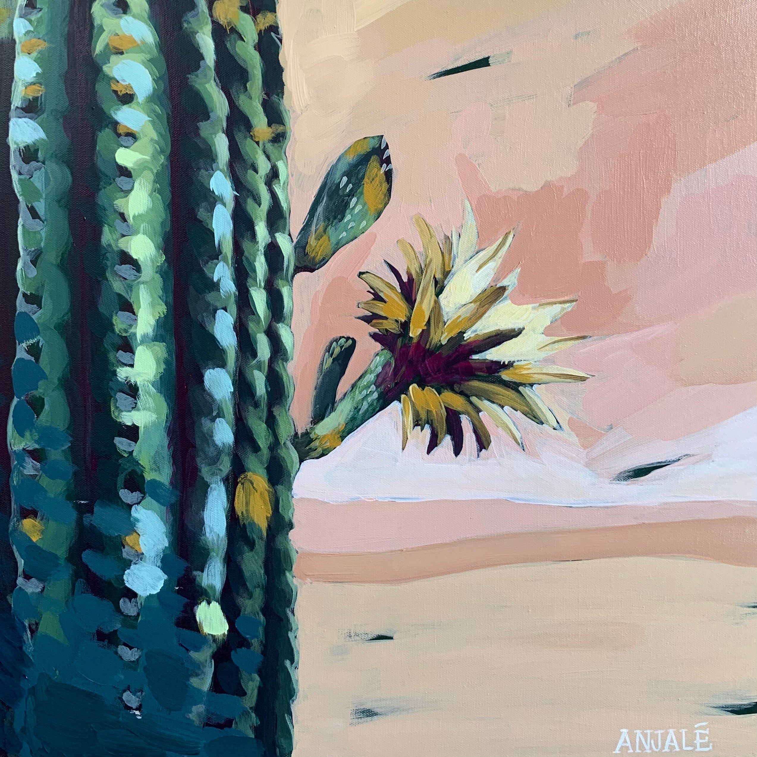 This piece is part of the Made in LA series, inspired by the canyon Anjalé called home and birds of paradise growing outside her grandmother’s bedroom window. It’s about the cacti and yucca trees dotting the LA mountains and the sharp blades of grass her little brother would pluck to make lizard traps in the summertime. She was made in LA, and so were these paintings.