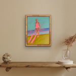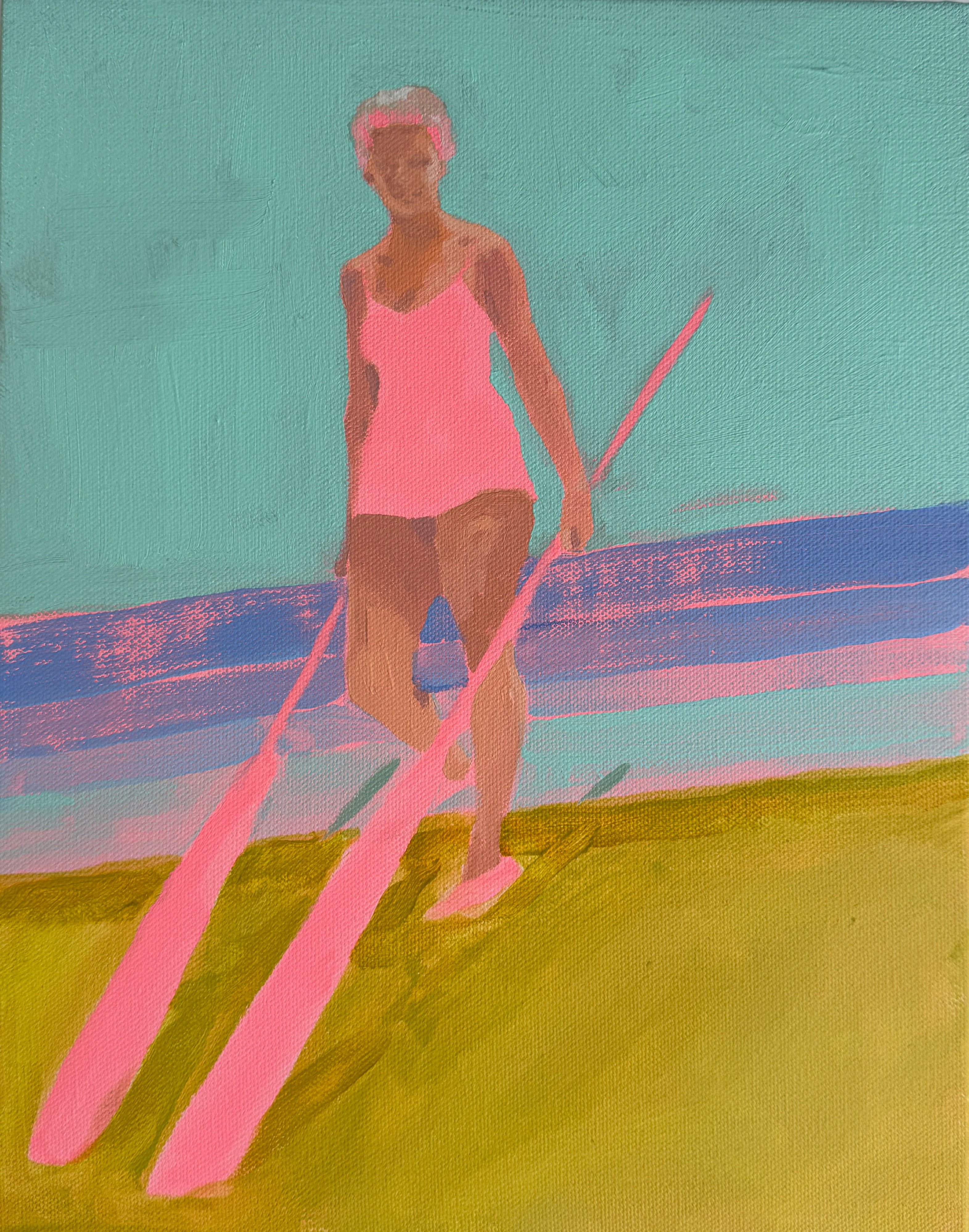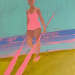 This piece is part of Anjalé's new playful figurative landscape series, Neon Nostalgia. Painting from vintage photographs - often black and white beach or pool scenes - she merges the vivid colors of her childhood memories in Los Angeles with each image, creating composite memoryscapes that feel entirely original. Fresh, quirky, and familiar, these paintings delve into themes of collective consciousness, shared experience, and reclaiming lost memories.
