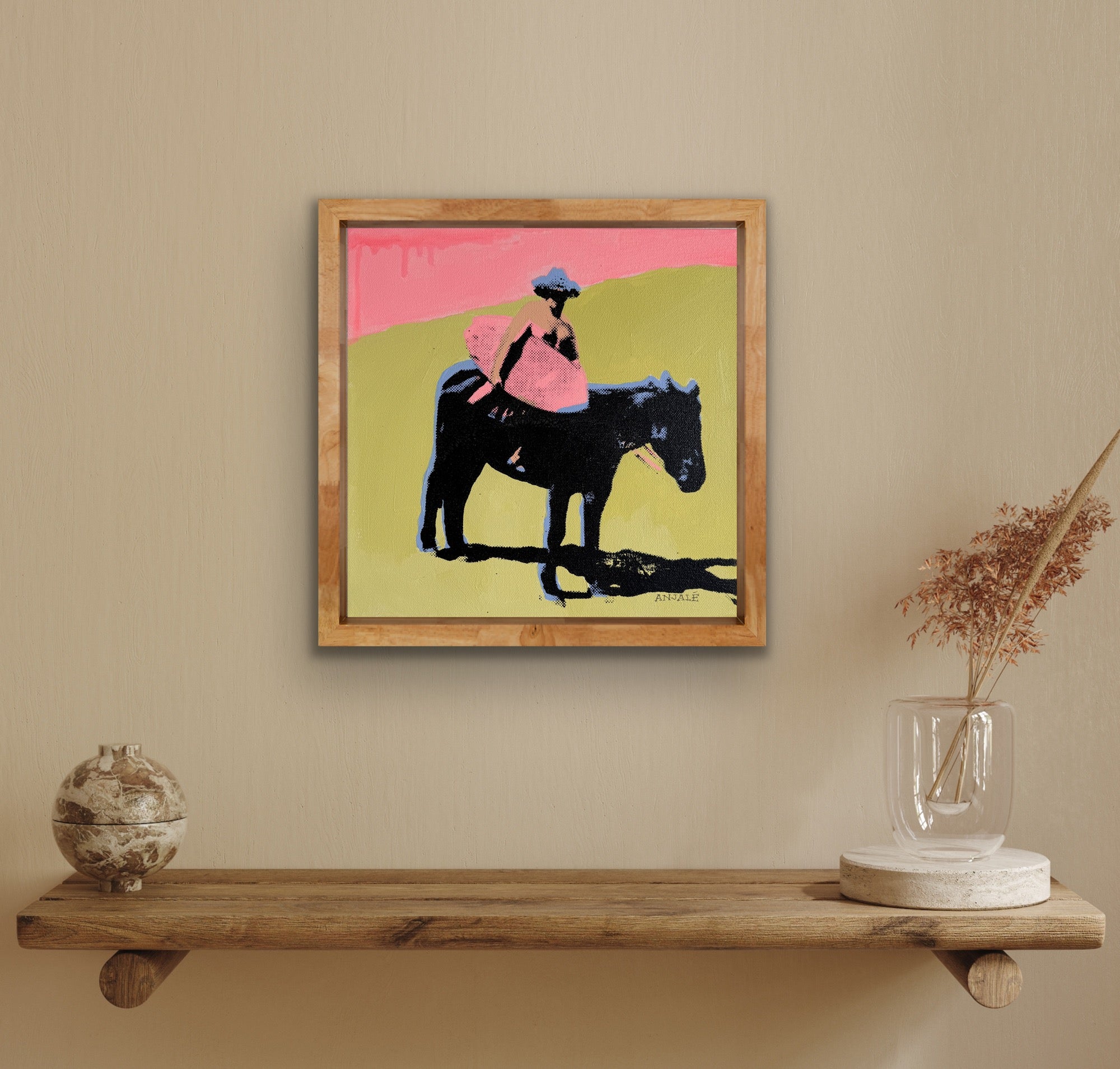 This piece is part of Anjalé's new playful figurative landscape series, Neon Nostalgia. Painting from vintage photographs - often black and white beach or pool scenes - she merges the vivid colors of her childhood memories in Los Angeles with each image, creating composite memoryscapes that feel entirely original. Fresh, quirky, and familiar, these paintings delve into themes of collective consciousness, shared experience, and reclaiming lost memories.