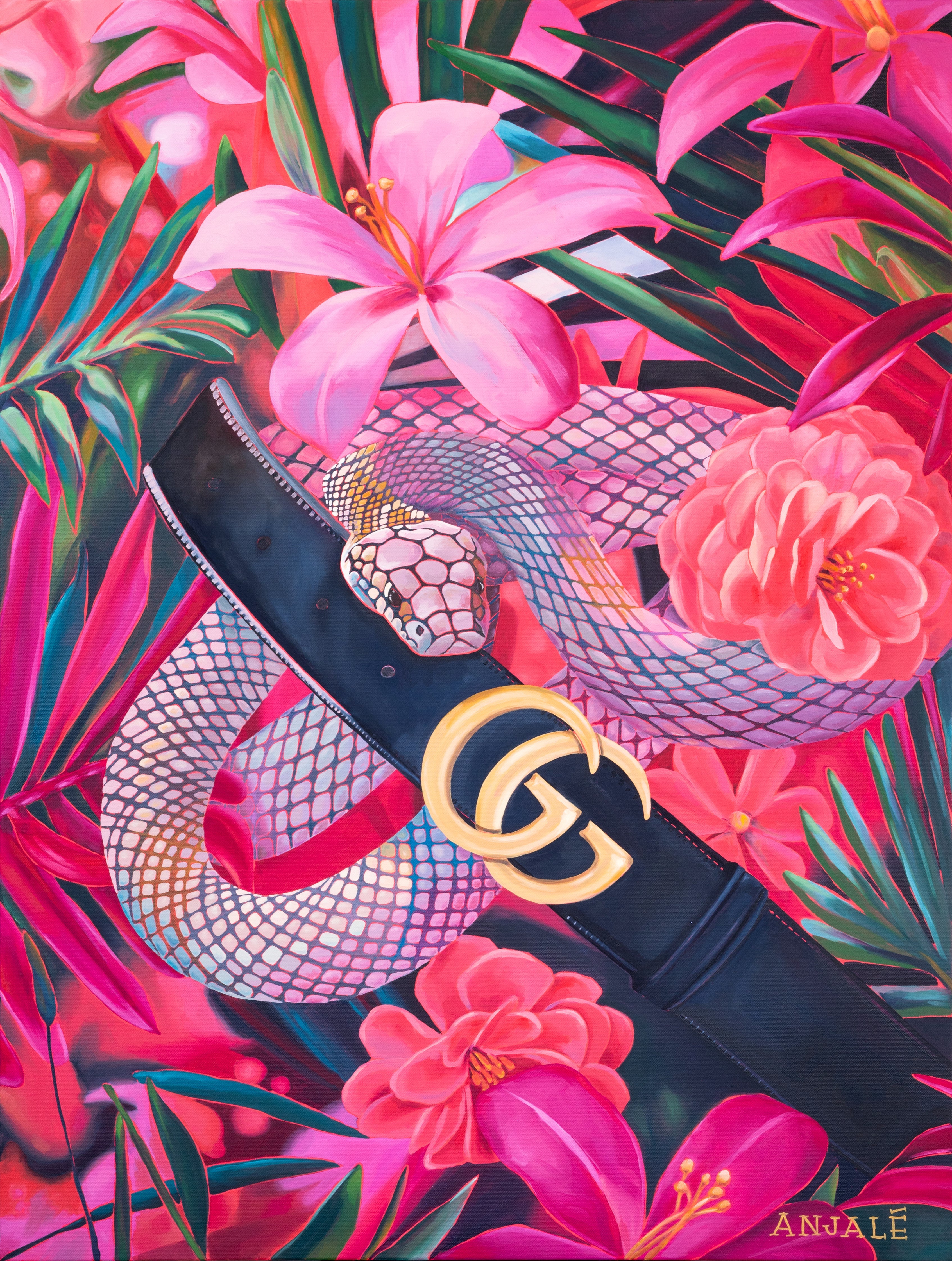 Anjalé is a talented visual artist specializing in oil paint with a focus on botanicals, snakes, couture, wild cats, and jungle scenes - sitting all under the umbrella of 'Exotic Flora & Fuana'. In addition to painting, she is also a skilled jewelry and interior designer. Her work has been showcased in numerous exhibitions, and her collectors are deeply passionate and devoted to her distinctive and captivating creations.