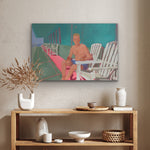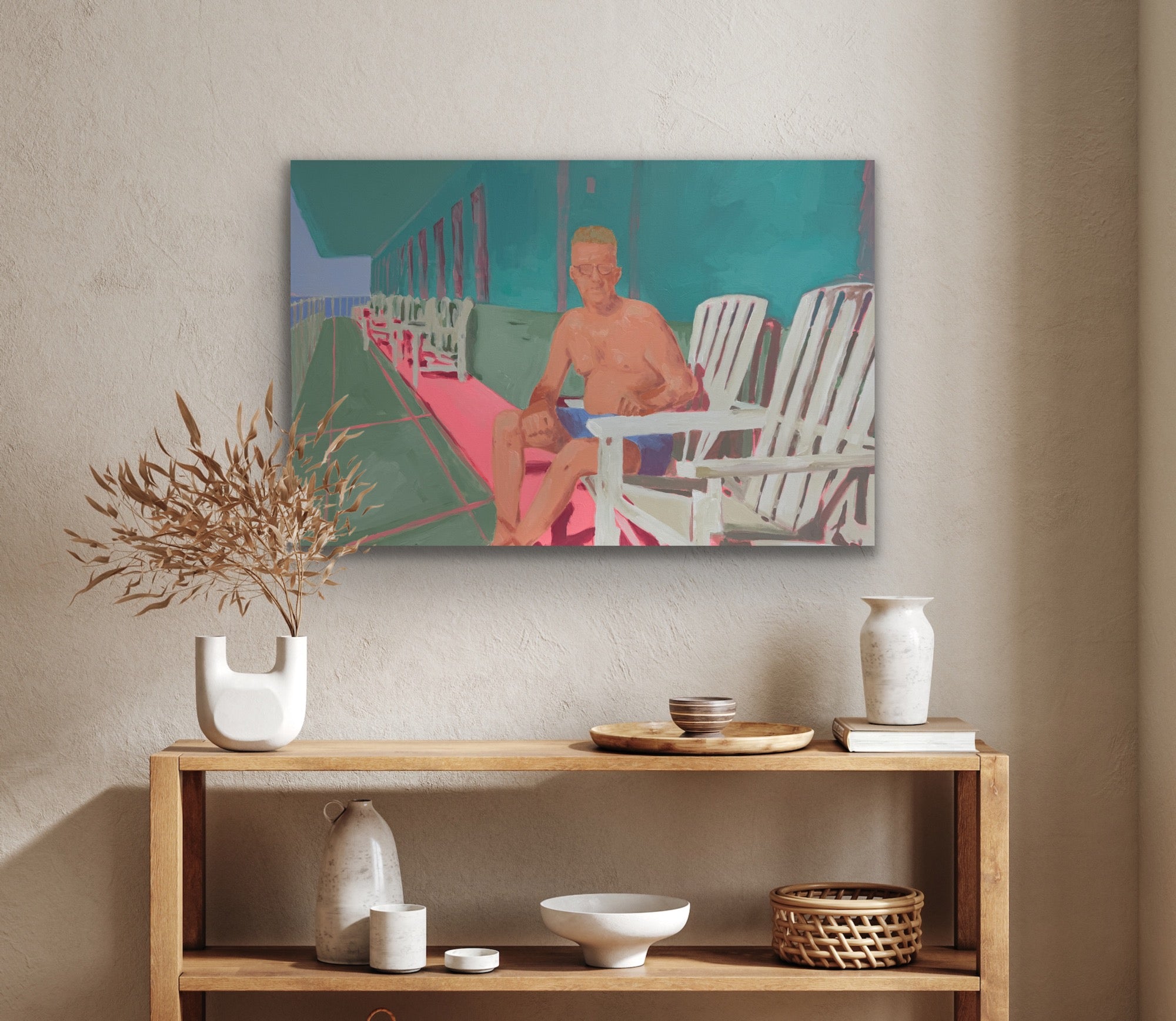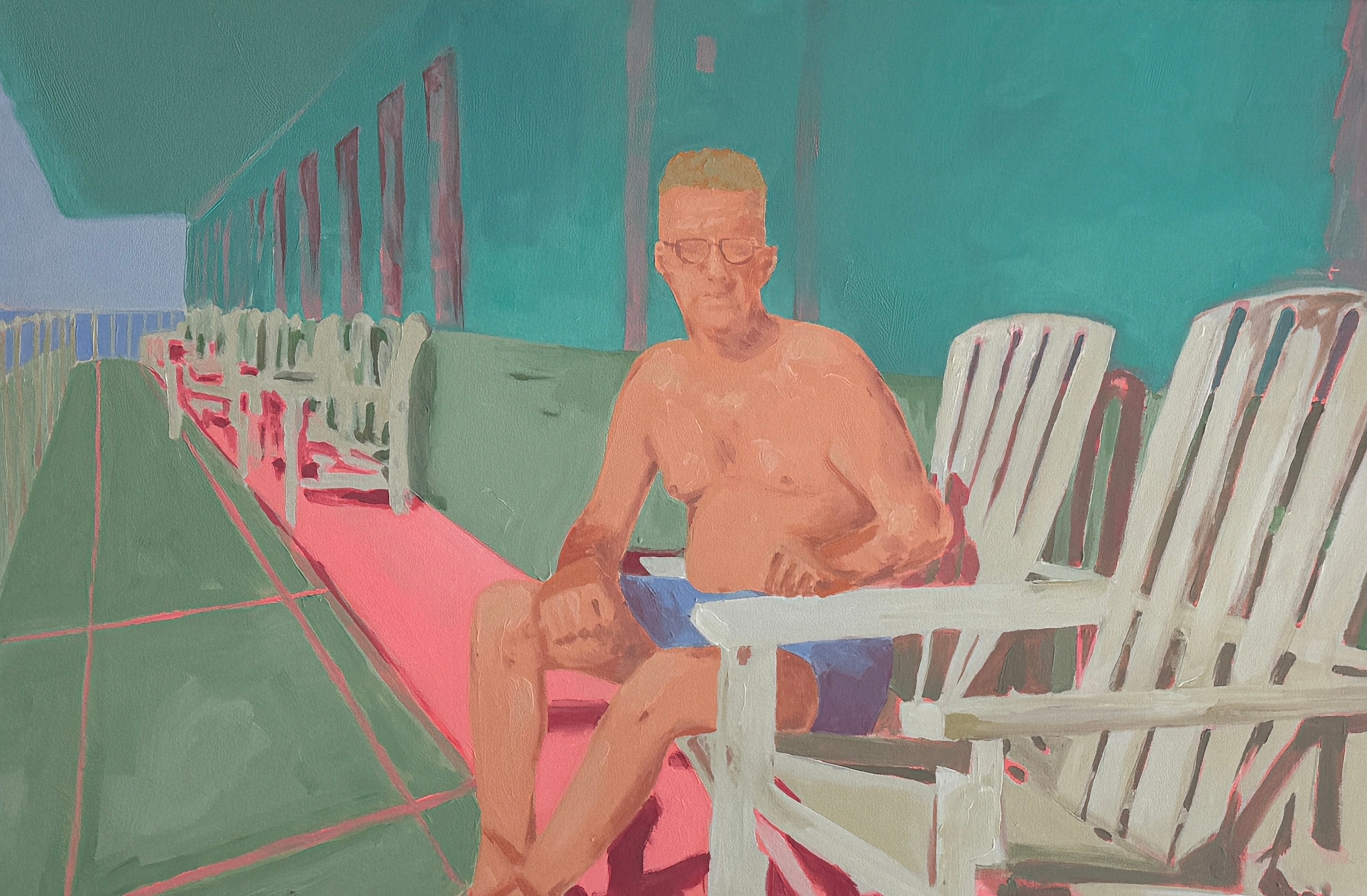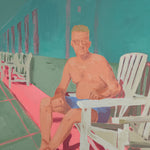 This piece is part of Anjalé's new playful figurative landscape series, Neon Nostalgia. Painting from vintage photographs - often black and white beach or pool scenes - she merges the vivid colors of her childhood memories in Los Angeles with each image, creating composite memoryscapes that feel entirely original. Fresh, quirky, and familiar, these paintings delve into themes of collective consciousness, shared experience, and reclaiming lost memories.
