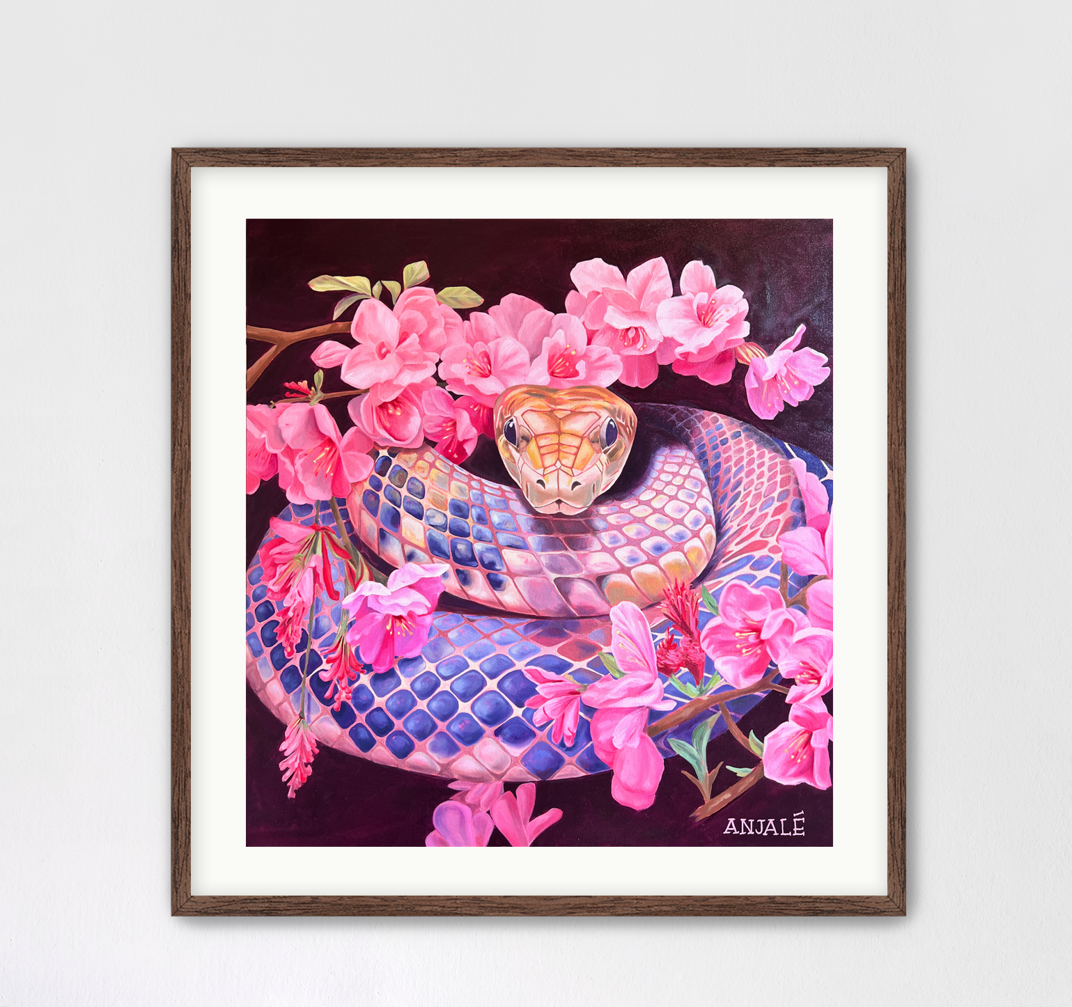 The Temptation series is here to offer a new way of viewing the world. Anjalé paints the snake in bright pinks, purples, and pastels to overturn the old binary of good vs. evil with a technicolor celebration of non-judgment and joy. What would happen if we all embraced the pleasure of the present moment without judgment? That’s the world she dreams of living in.