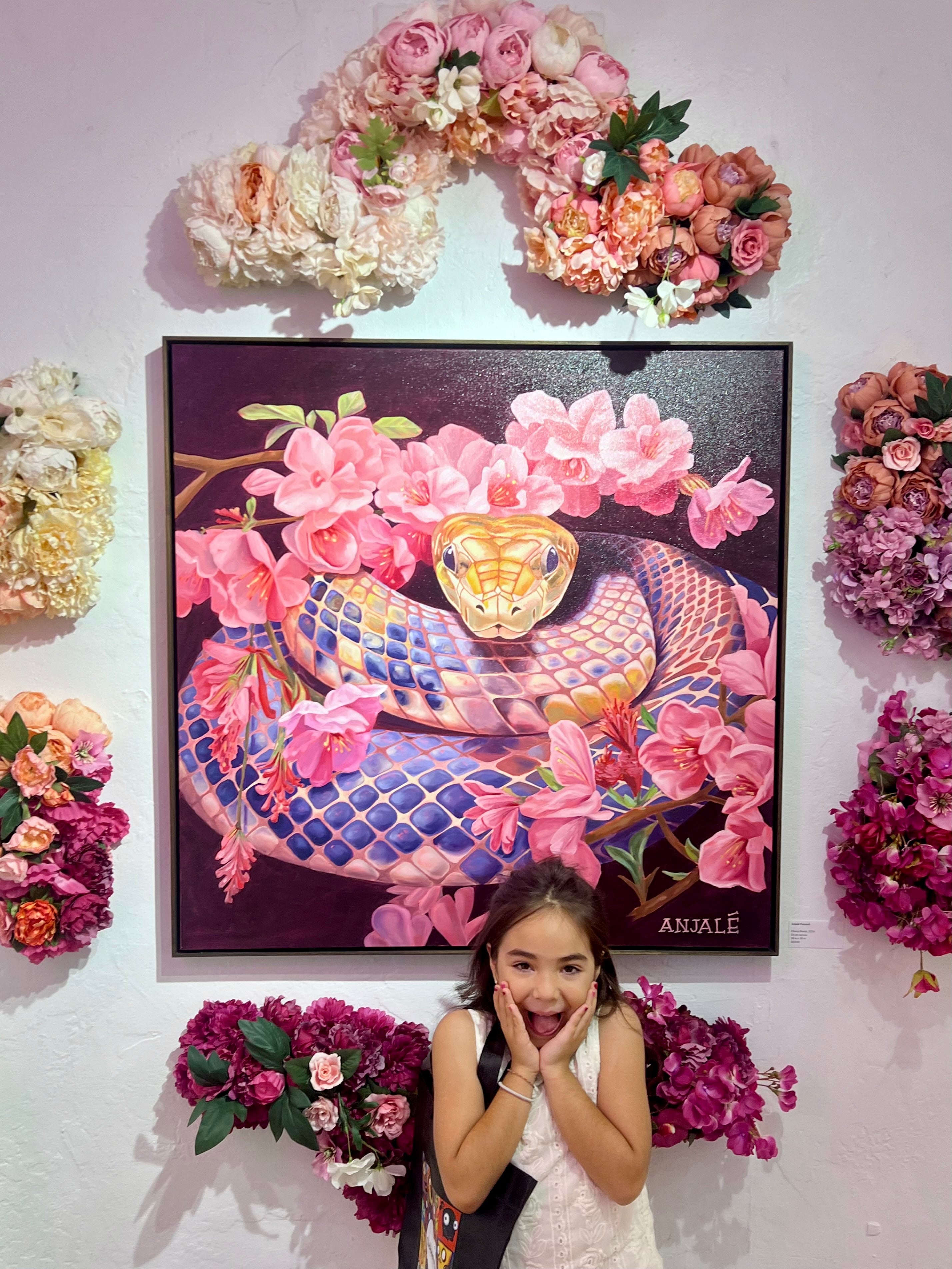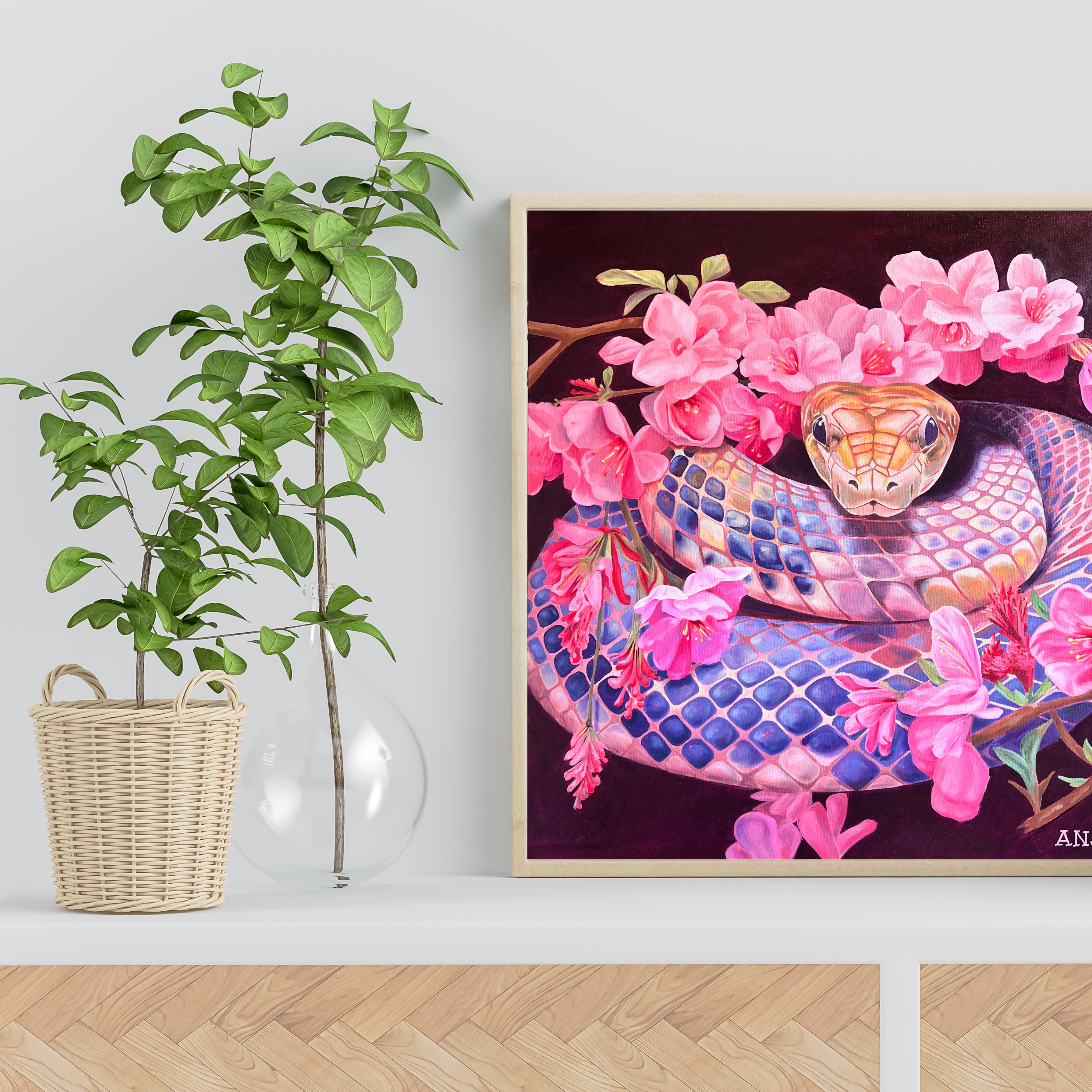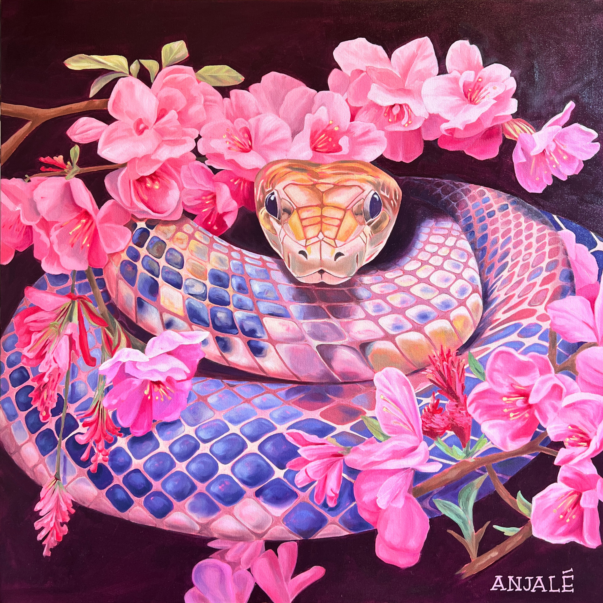 The Temptation series is here to offer a new way of viewing the world. Anjalé paints the snake in bright pinks, purples, and pastels to overturn the old binary of good vs. evil with a technicolor celebration of non-judgment and joy. What would happen if we all embraced the pleasure of the present moment without judgment? That’s the world she dreams of living in.