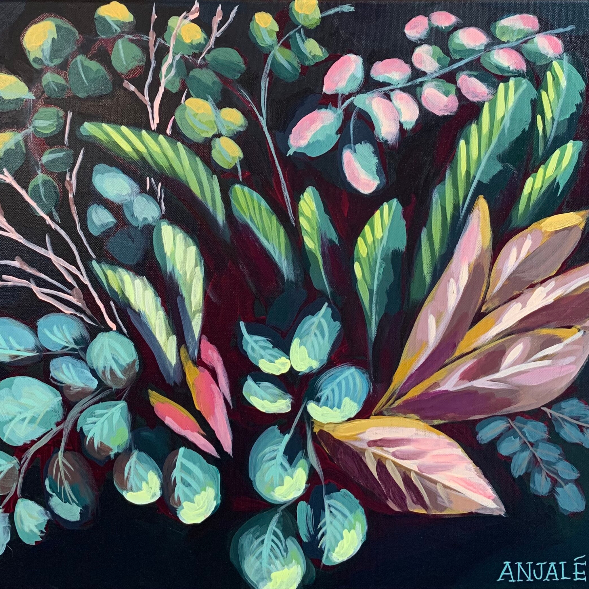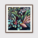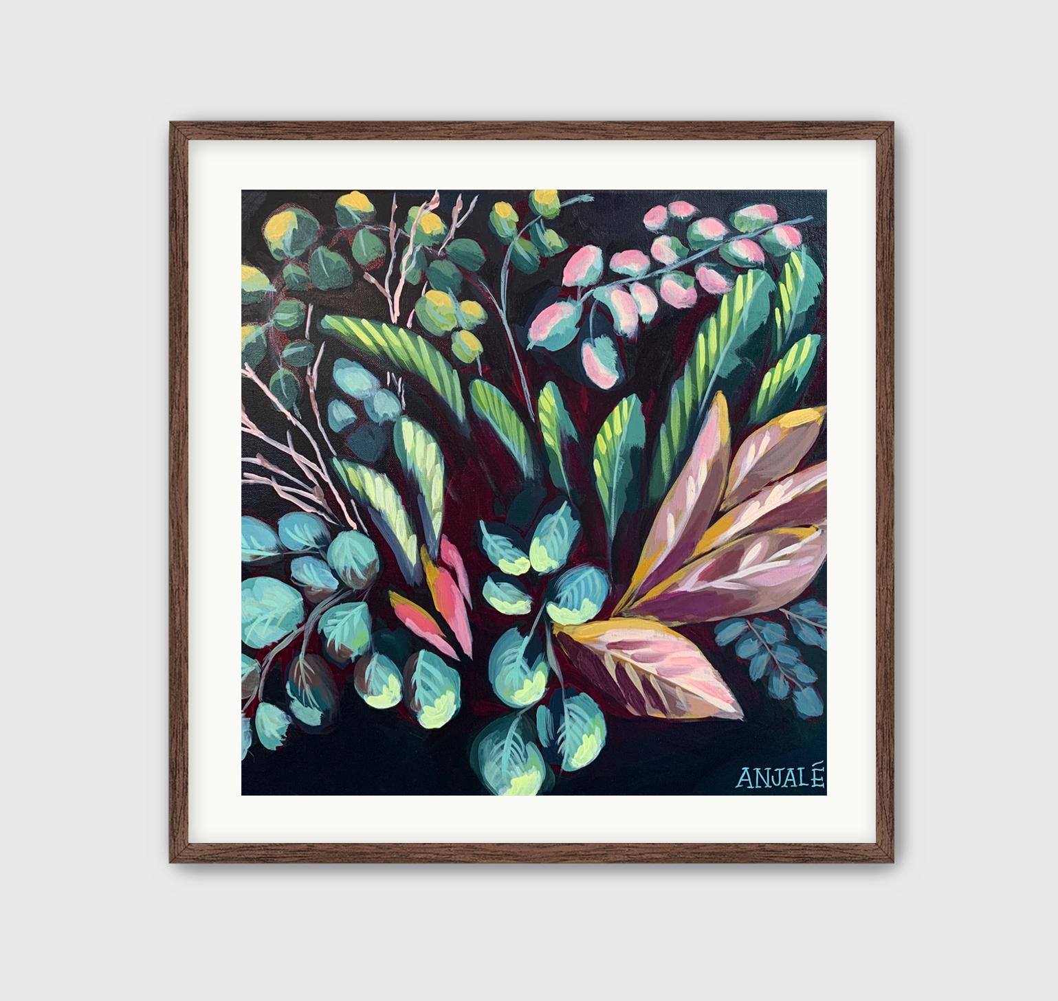 Enter the world of imagination, dreams, the subconscious … this painting takes you into the space between. Whimsical and lush with foliage of all colors set on a dark emerald backdrop, this piece is reminiscent of fairy tales and children’s books. The perfect accomplice to each of our very serious and important grown-up lives.