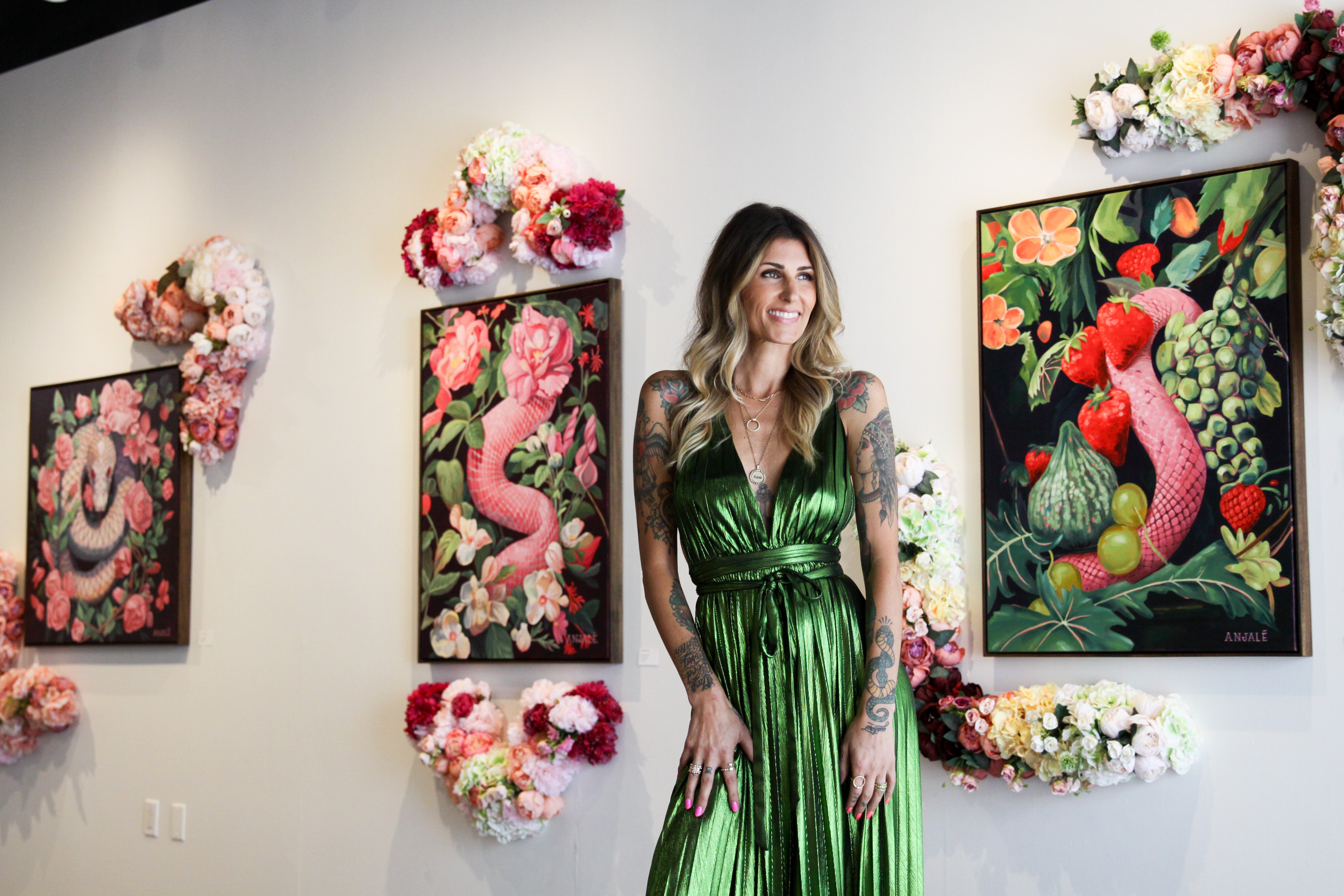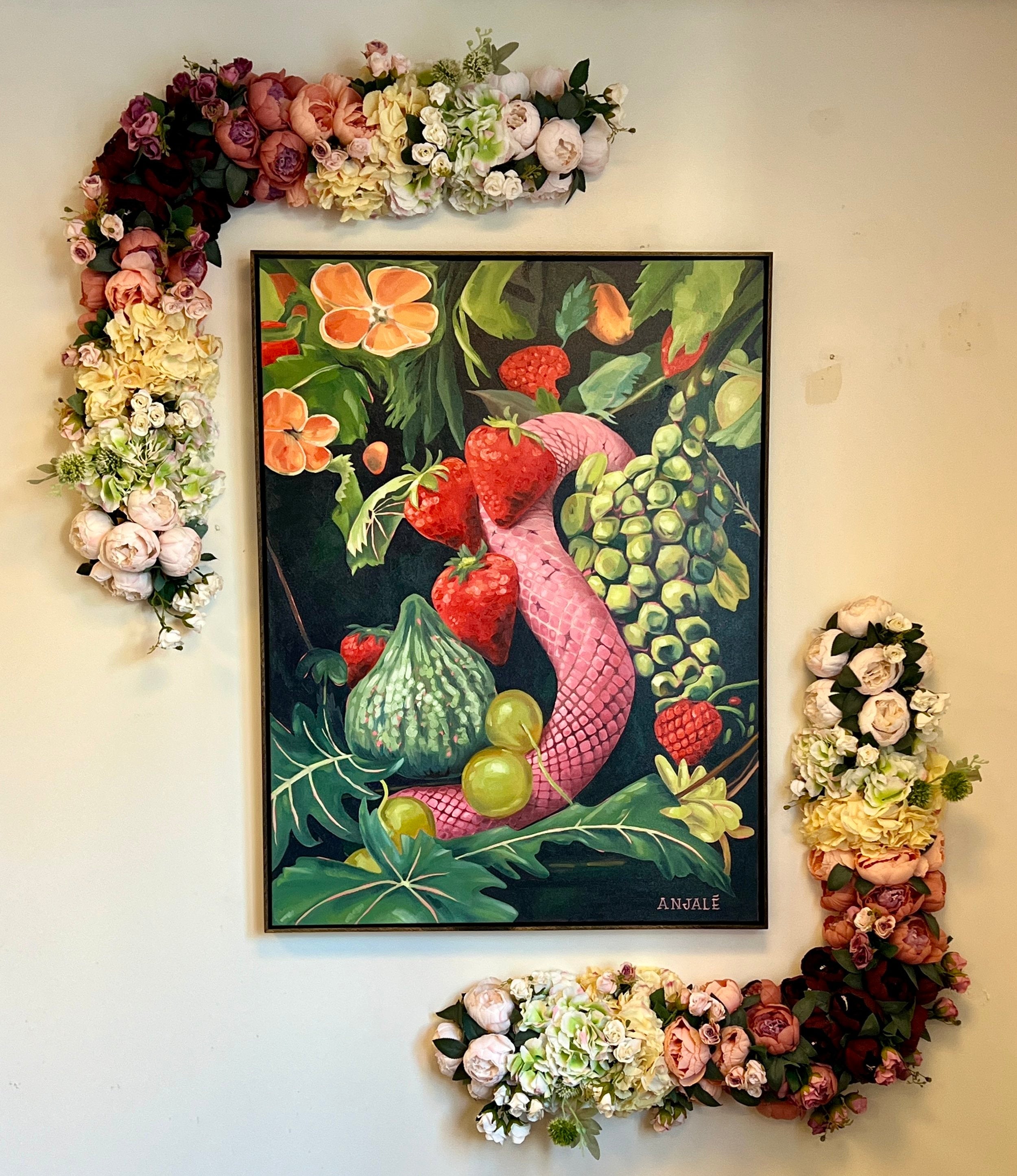 The Temptation series is here to offer a new way of viewing the world. Anjalé paints the snake in bright pinks, purples, and pastels to overturn the old binary of good vs. evil with a technicolor celebration of non-judgment and joy. What would happen if we all embraced the pleasure of the present moment without judgment? That’s the world she dreams of living in.