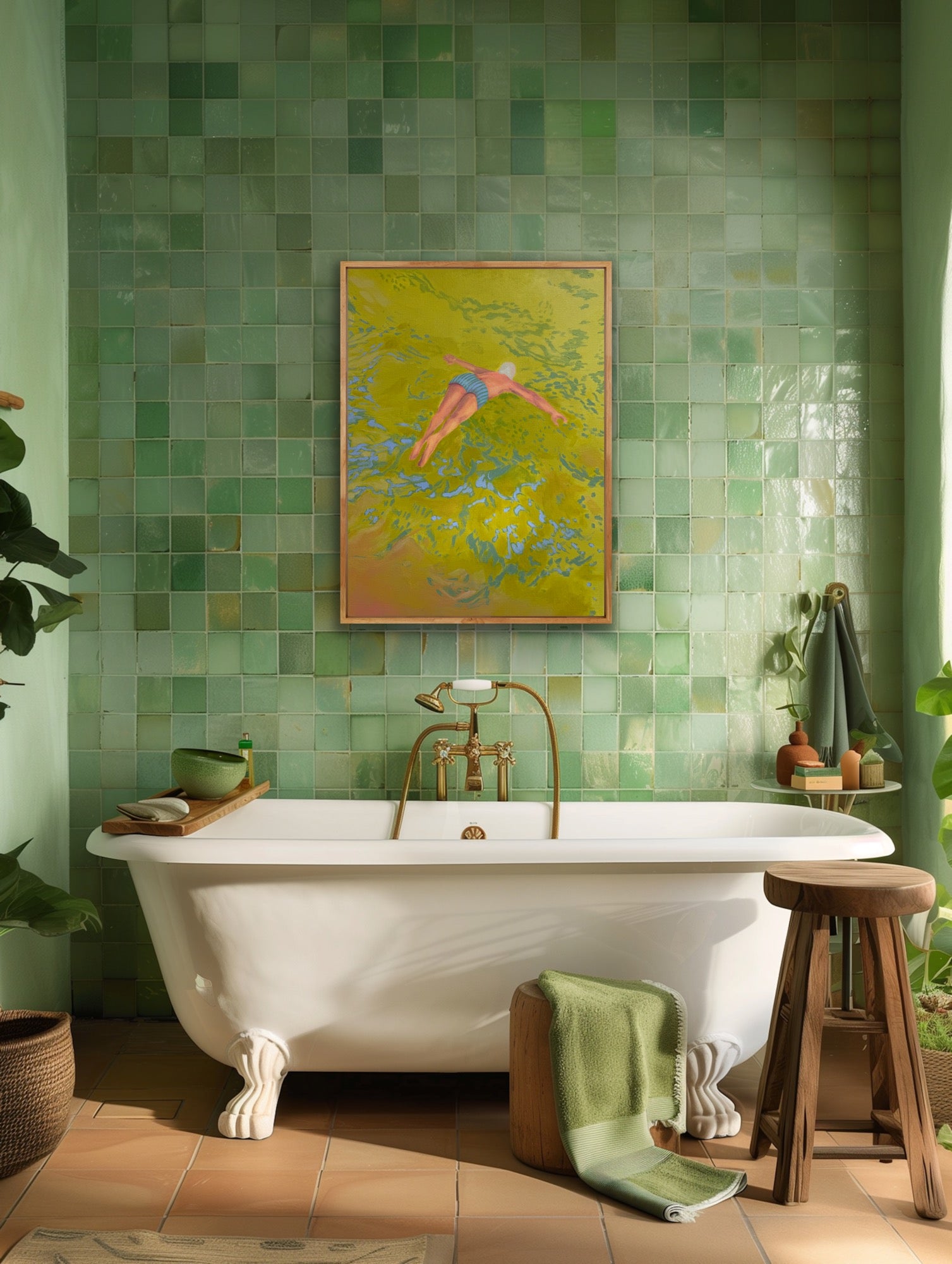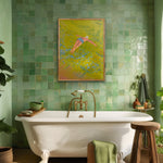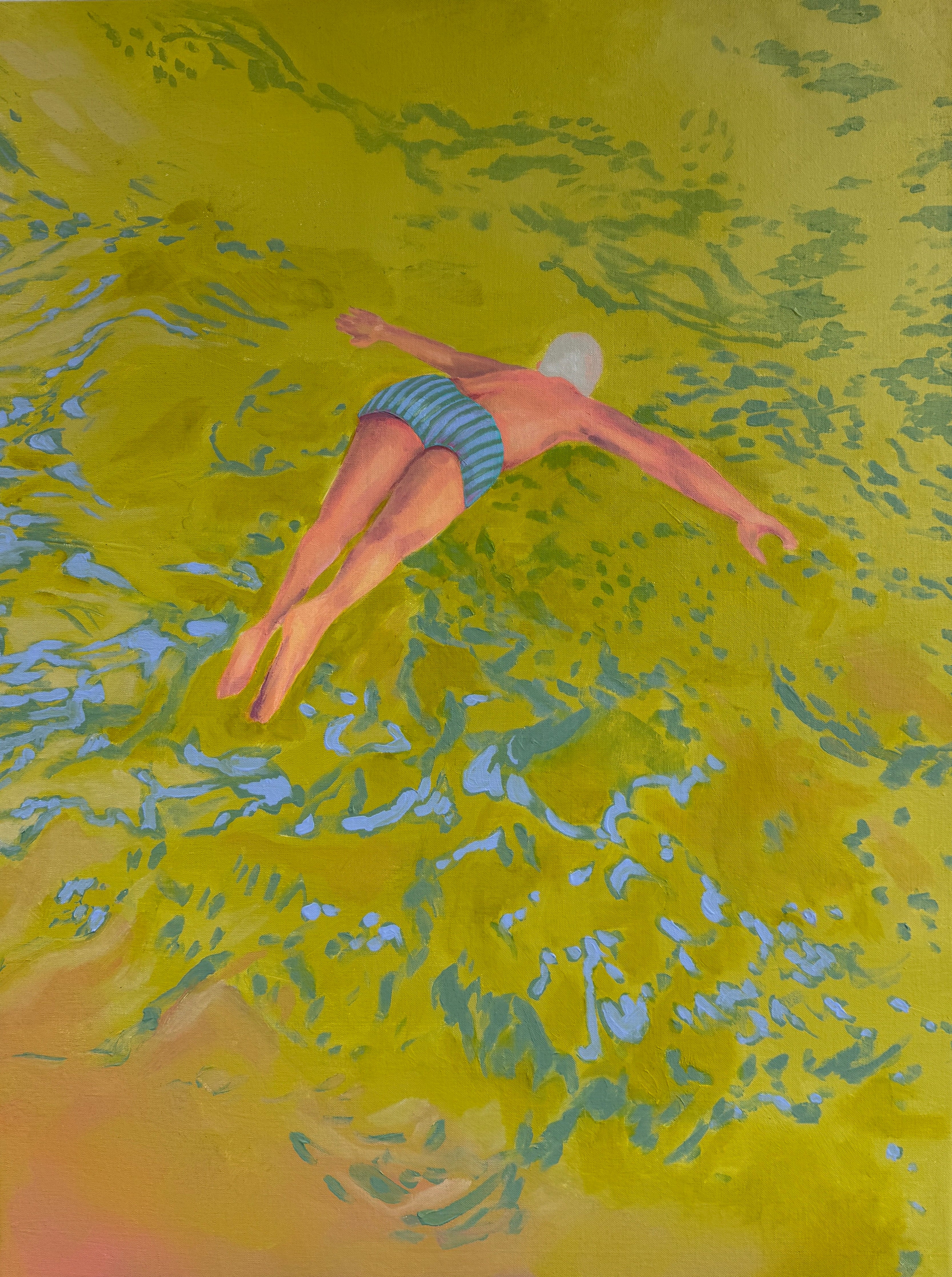 This piece is part of Anjalé's new playful figurative landscape series, Neon Nostalgia. Painting from vintage photographs - often black and white beach or pool scenes - she merges the vivid colors of her childhood memories in Los Angeles with each image, creating composite memoryscapes that feel entirely original. Fresh, quirky, and familiar, these paintings delve into themes of collective consciousness, shared experience, and reclaiming lost memories.