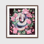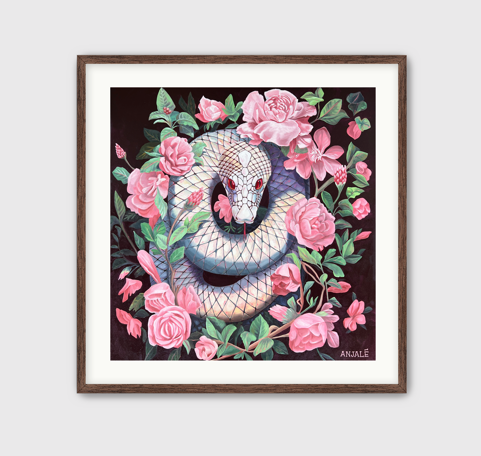 The Temptation series is here to offer a new way of viewing the world. Anjalé paints the snake in bright pinks, purples, and pastels to overturn the old binary of good vs. evil with a technicolor celebration of non-judgment and joy. What would happen if we all embraced the pleasure of the present moment without judgment? That’s the world she dreams of living in.