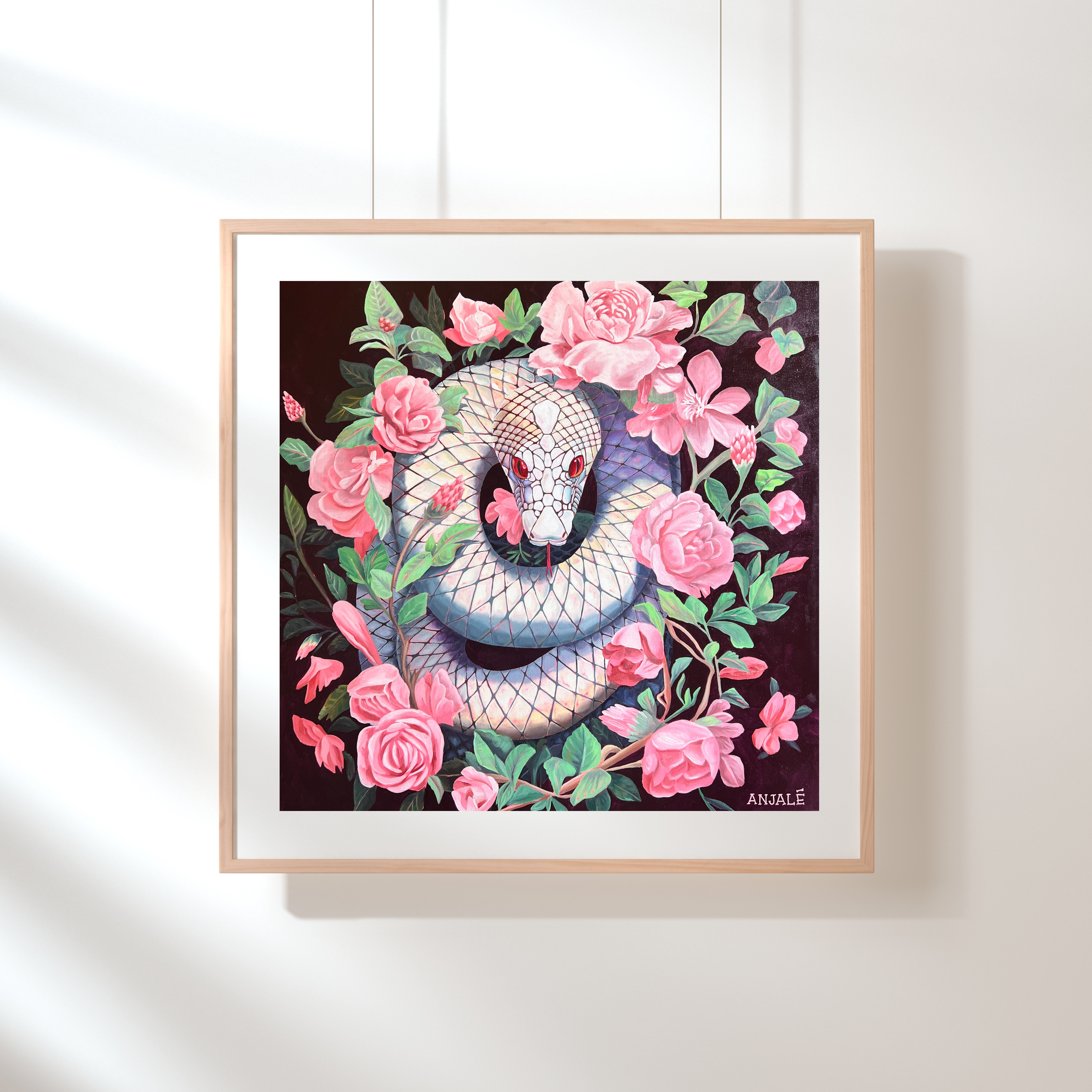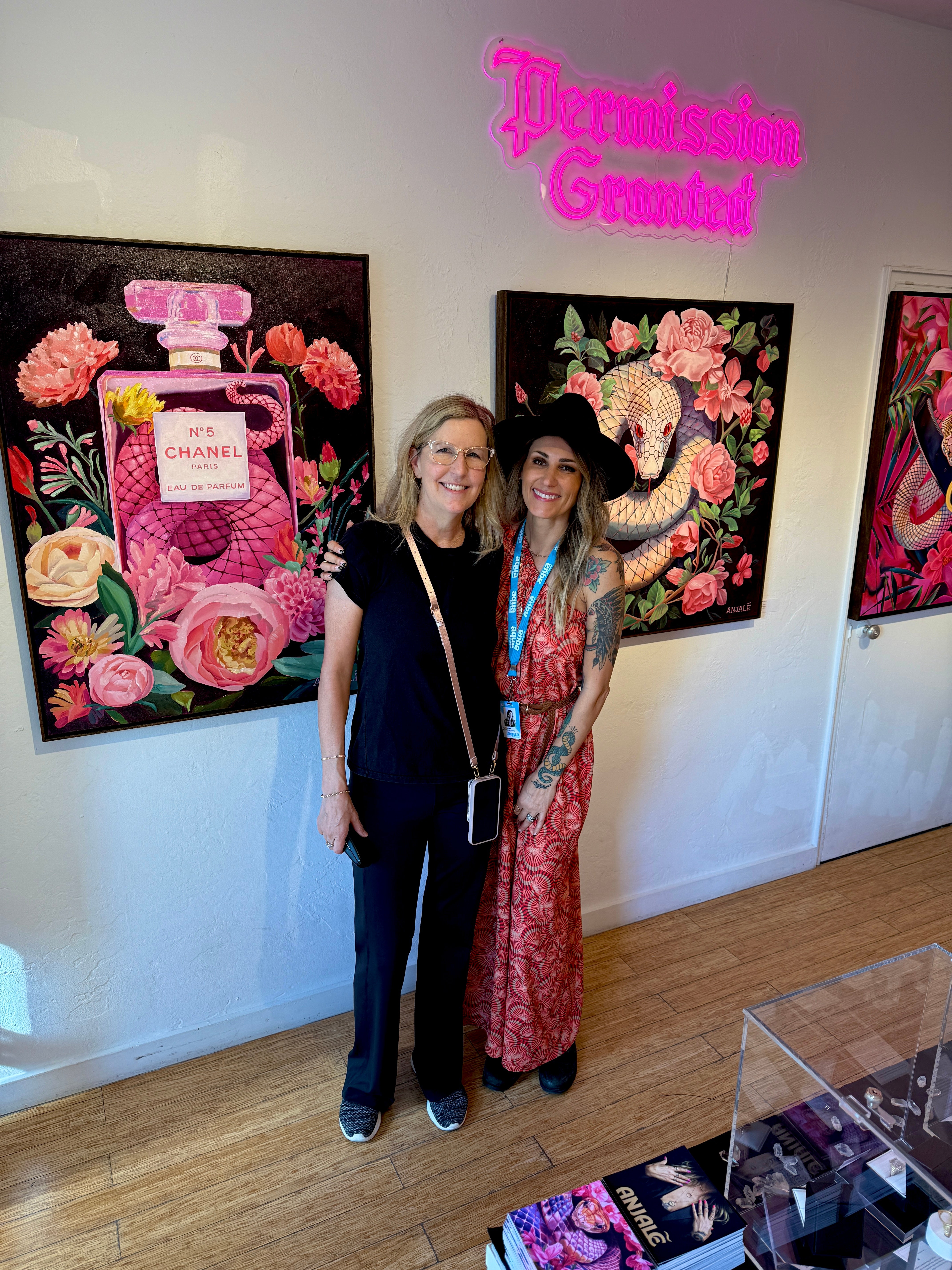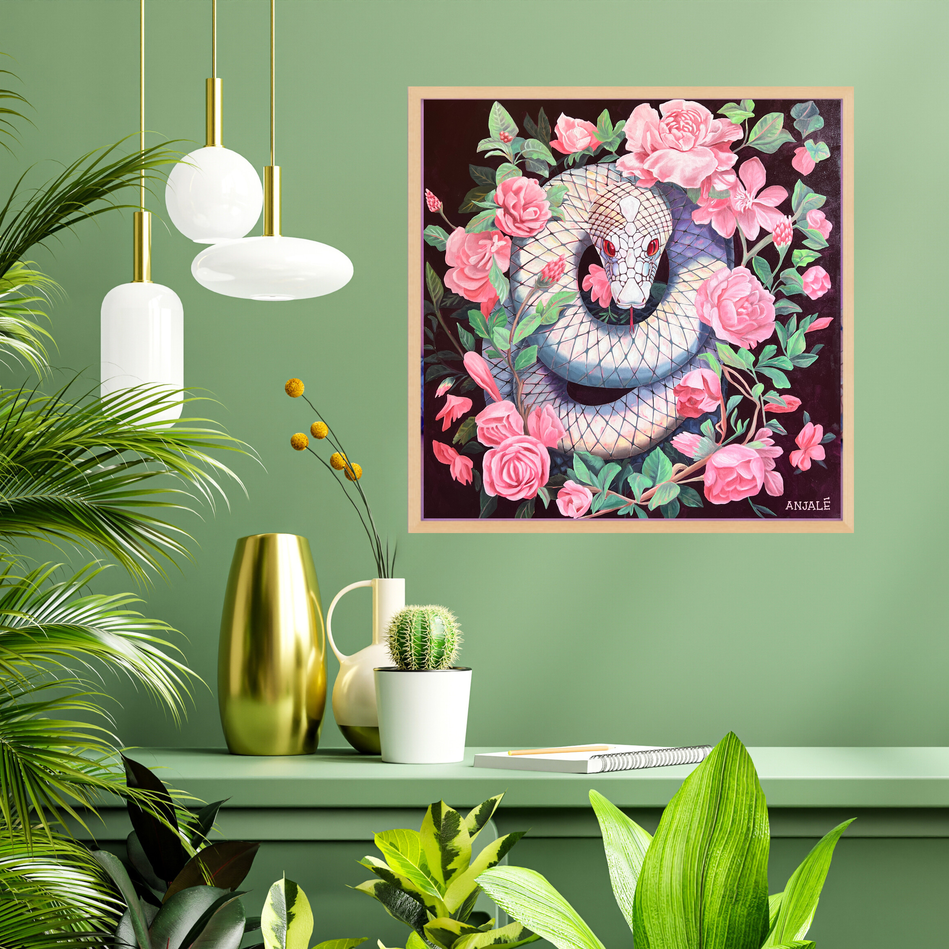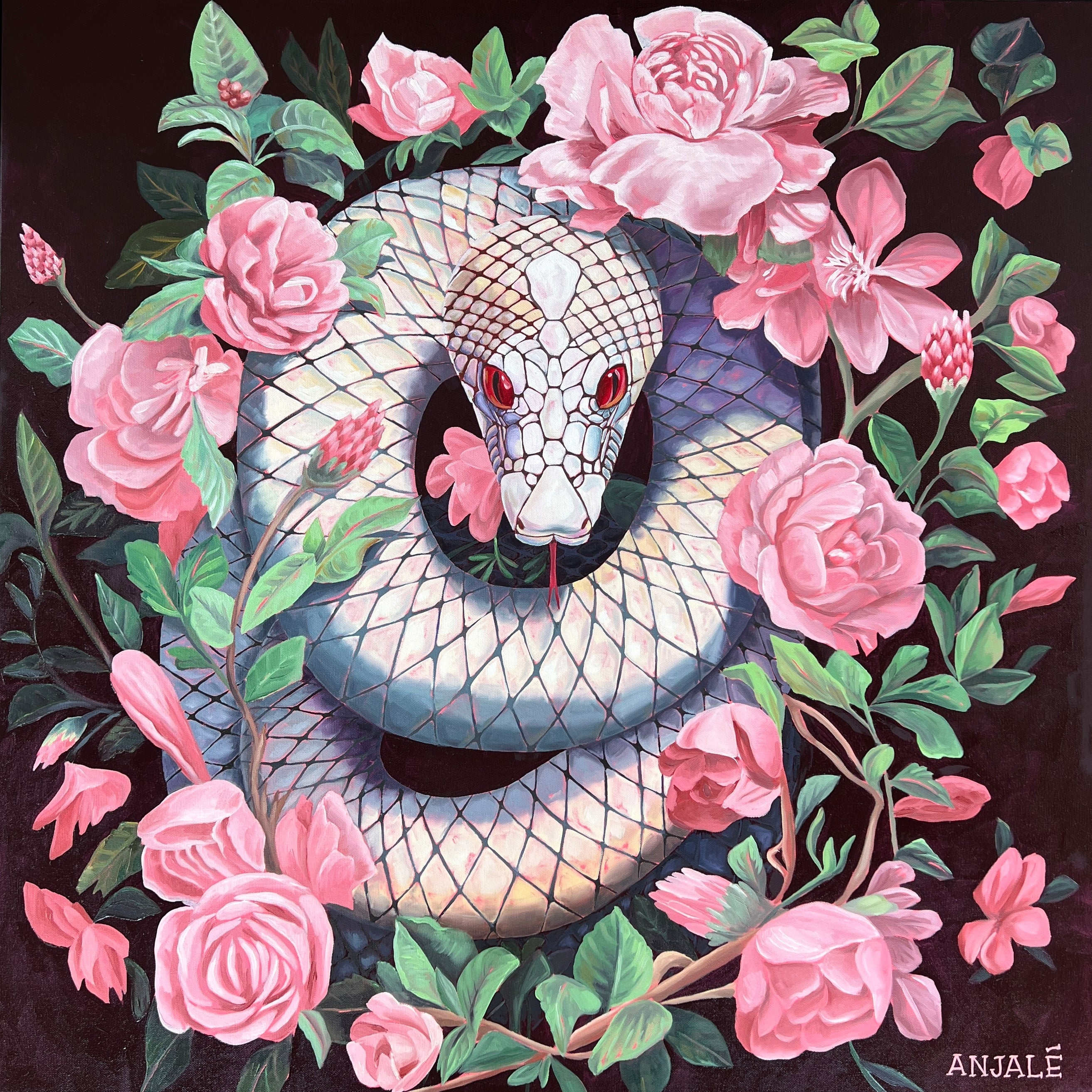 The Temptation series is here to offer a new way of viewing the world. Anjalé paints the snake in bright pinks, purples, and pastels to overturn the old binary of good vs. evil with a technicolor celebration of non-judgment and joy. What would happen if we all embraced the pleasure of the present moment without judgment? That’s the world she dreams of living in.