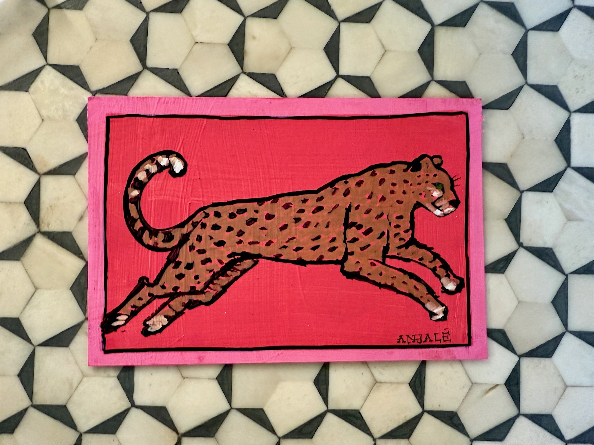 Hand painted in the signature flamingo pink as a base, on the reserve of the 'Temptation' solo show postcards this multi media painting uses sharpie, paint pen and gouache.