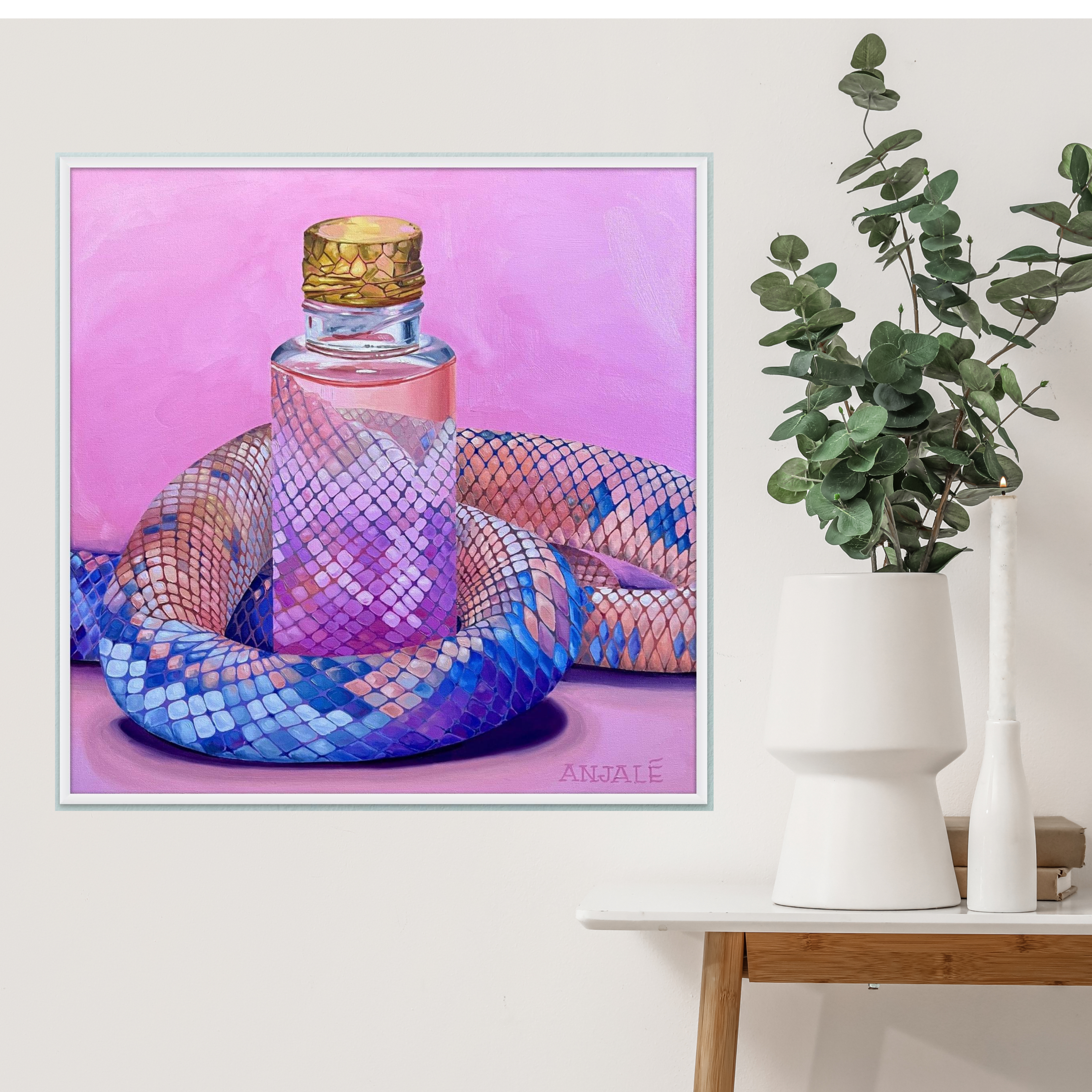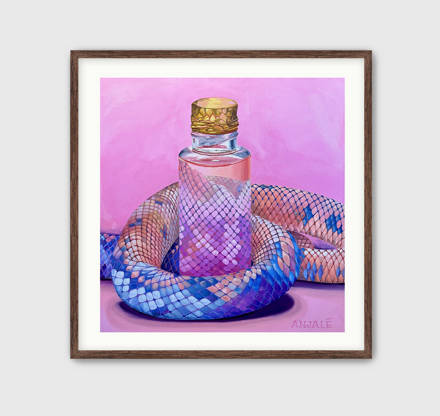 The Temptation series is here to offer a new way of viewing the world. Anjalé paints the snake in bright pinks, purples, and pastels to overturn the old binary of good vs. evil with a technicolor celebration of non-judgment and joy. What would happen if we all embraced the pleasure of the present moment without judgment? That’s the world she dreams of living in.