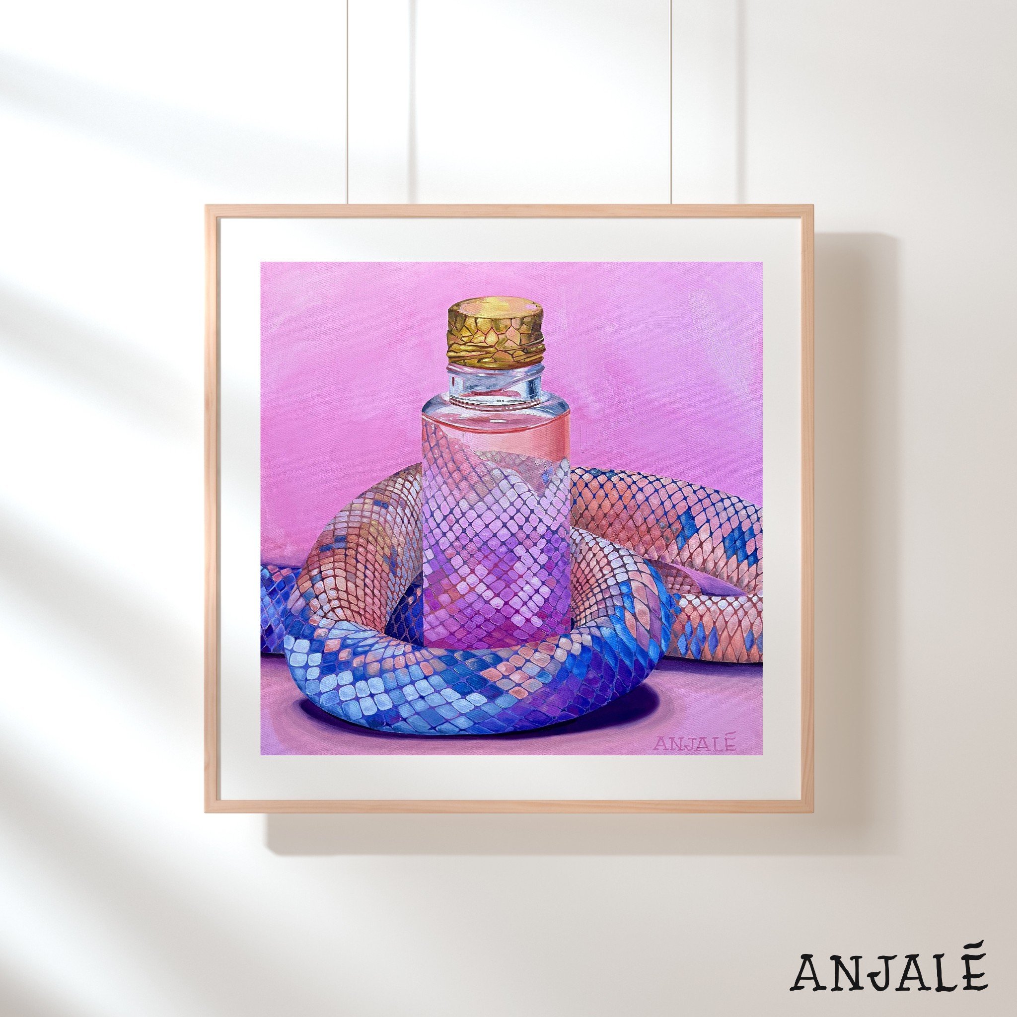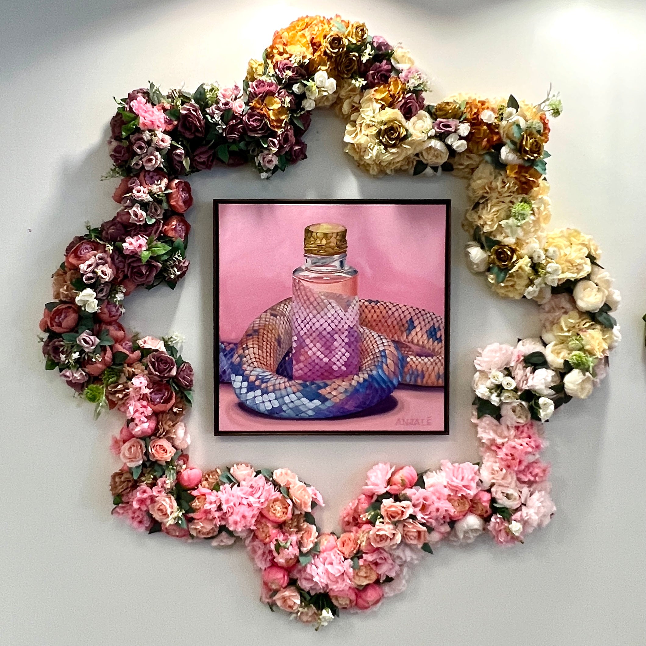 The Temptation series is here to offer a new way of viewing the world. Anjalé paints the snake in bright pinks, purples, and pastels to overturn the old binary of good vs. evil with a technicolor celebration of non-judgment and joy. What would happen if we all embraced the pleasure of the present moment without judgment? That’s the world she dreams of living in.