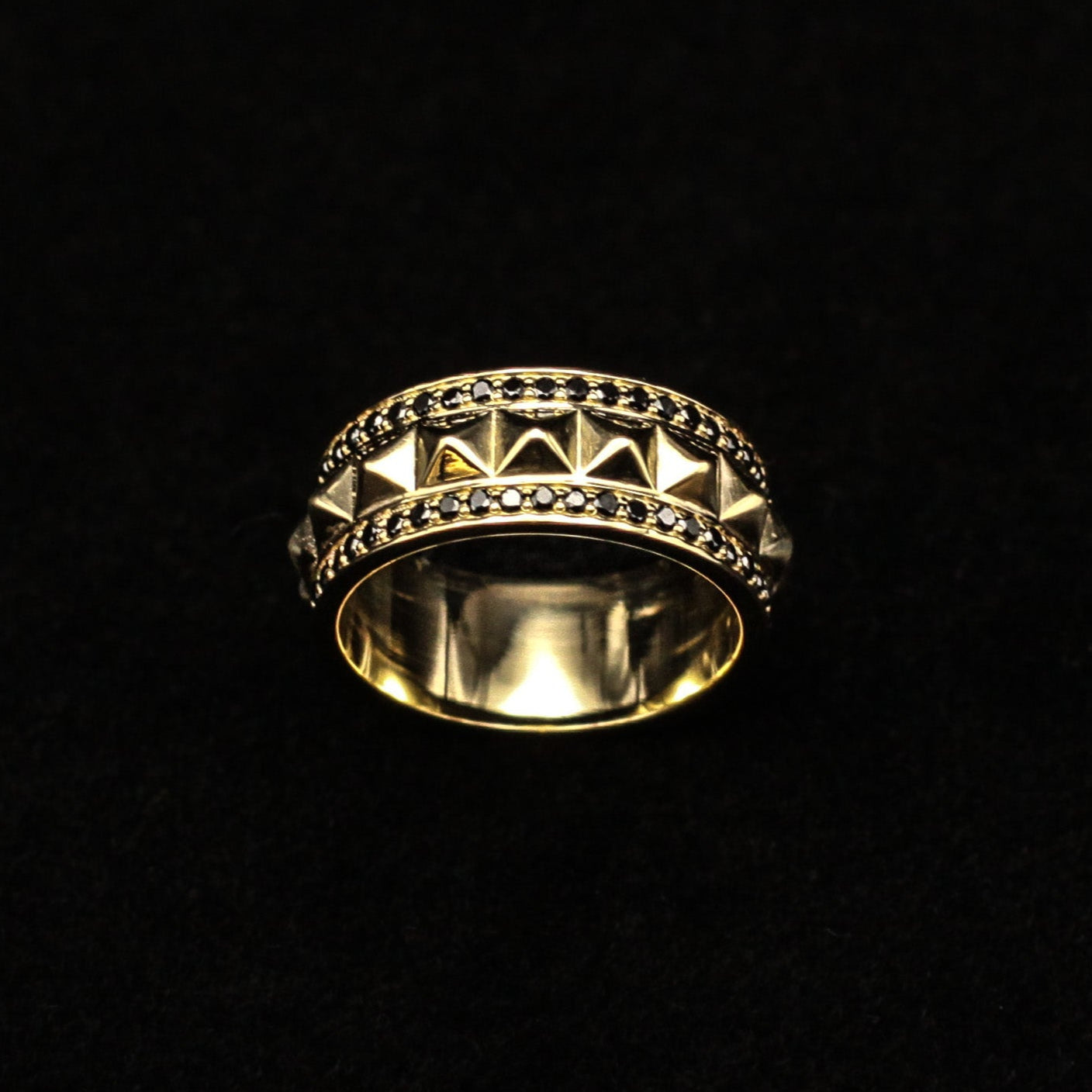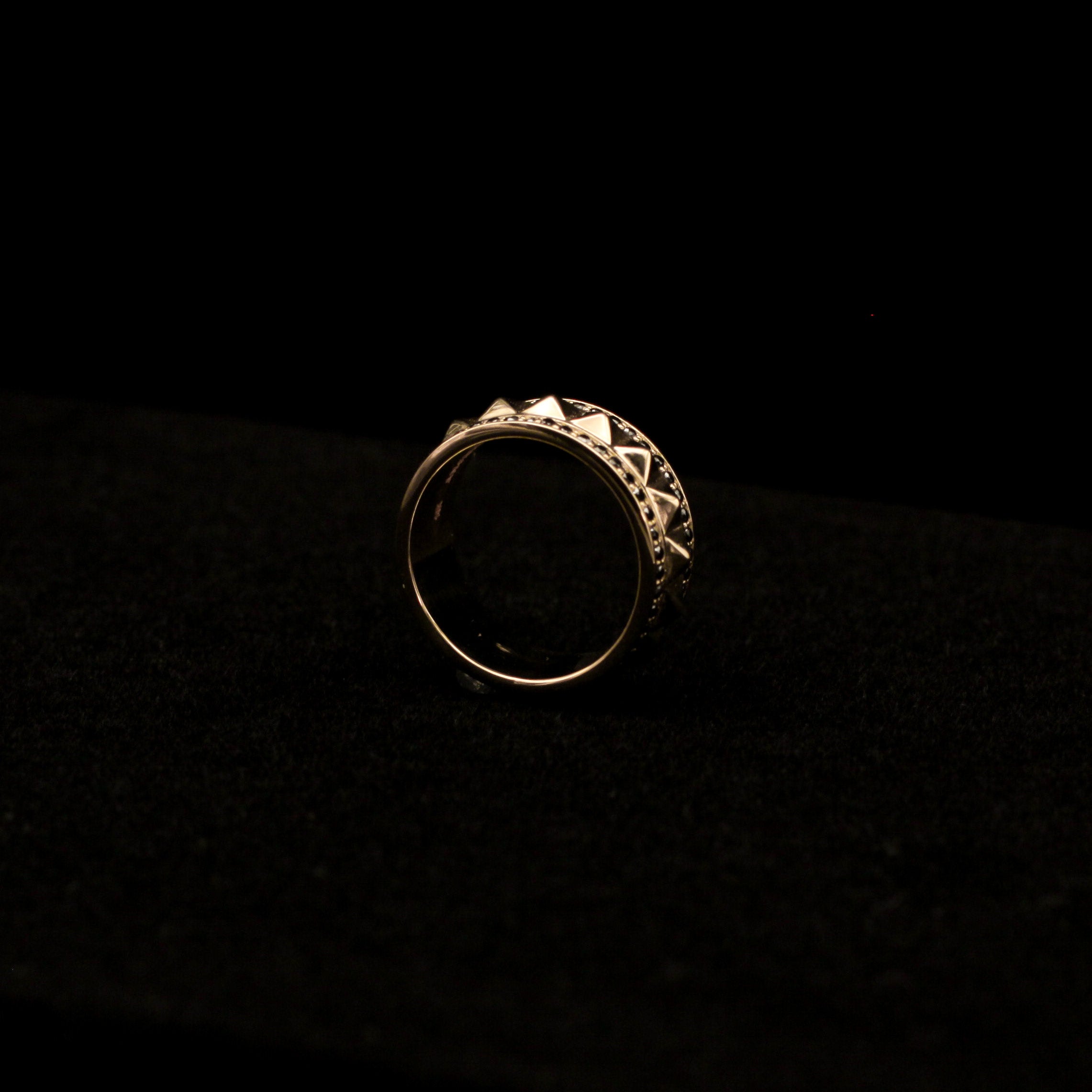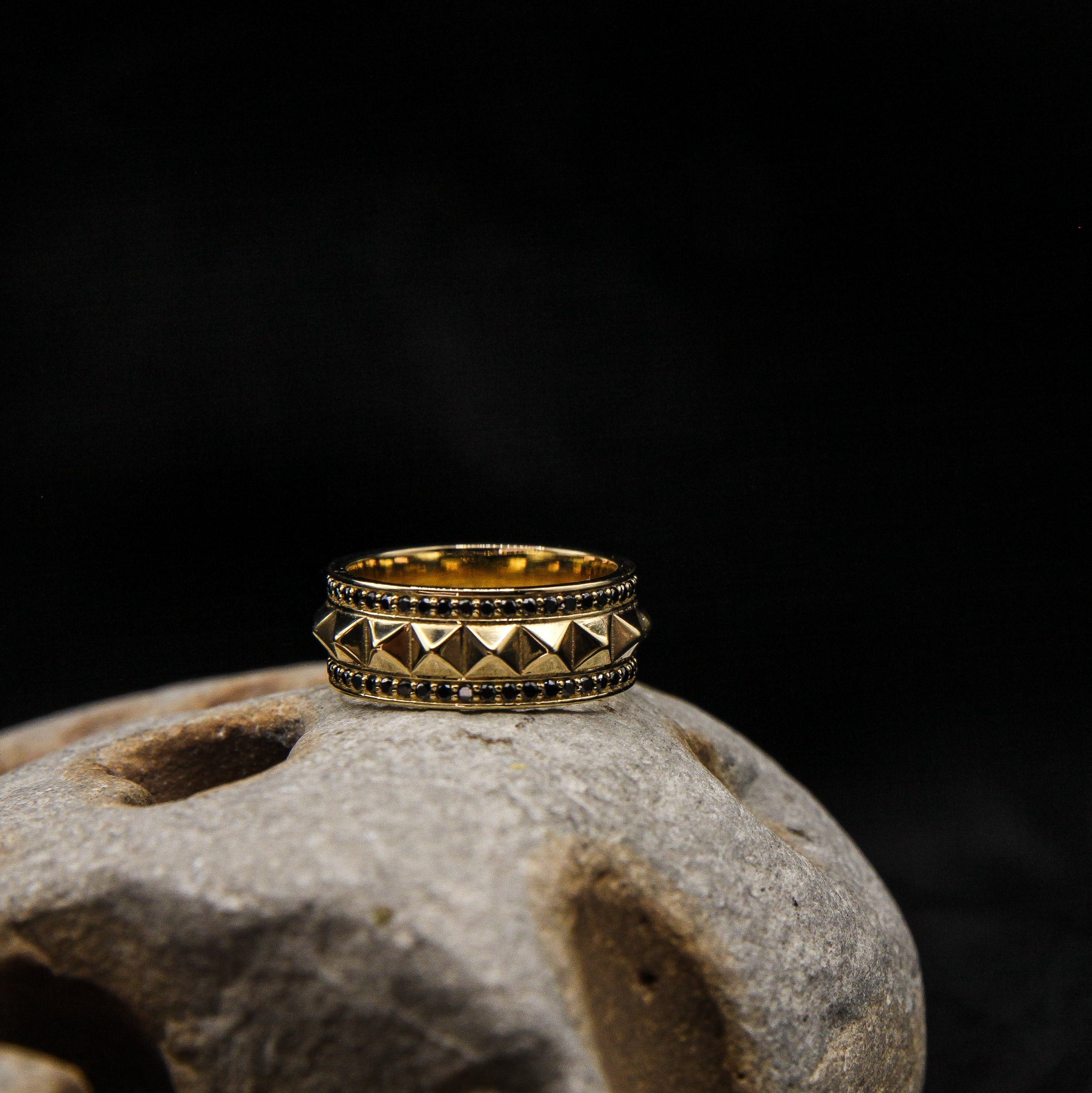 The intricately detailed studs and gemstones of this piece are meticulously laser cleaned by hand, ensuring flawless delivery of this heirloom ring.