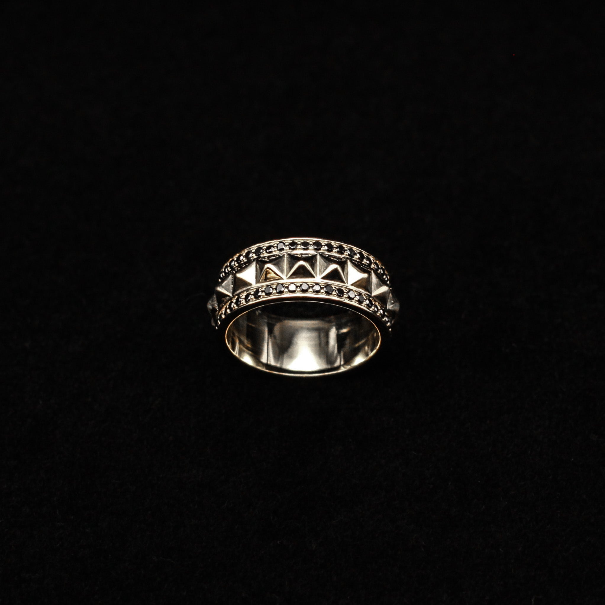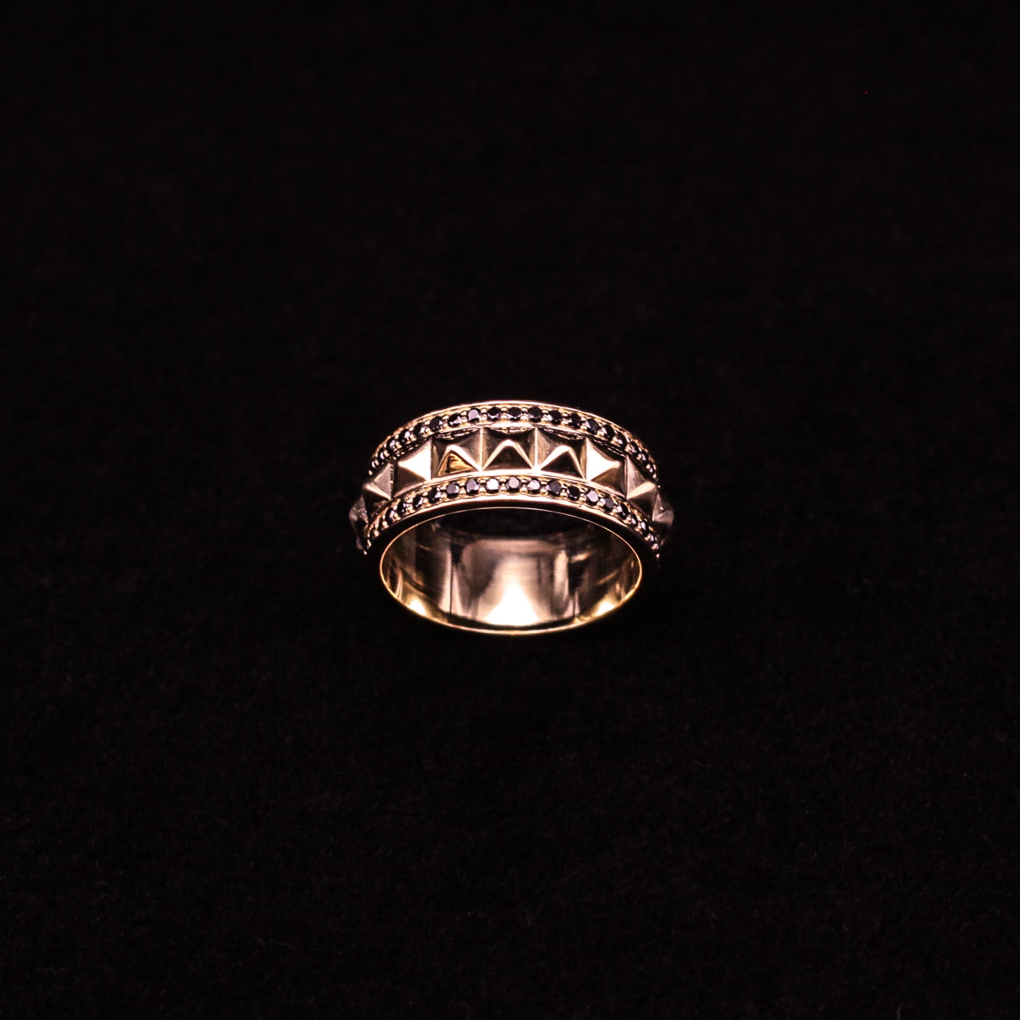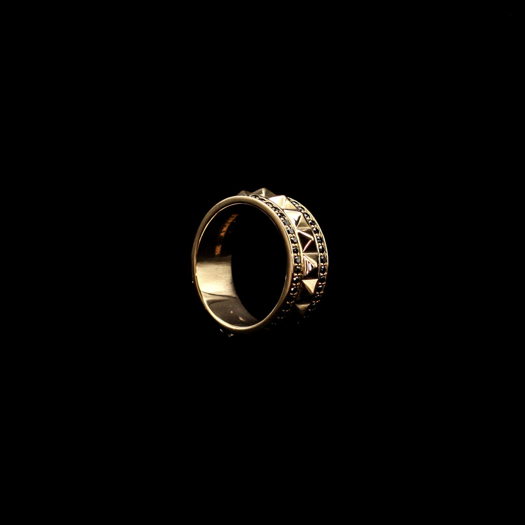 The intricately detailed studs and gemstones of this piece are meticulously laser cleaned by hand, ensuring flawless delivery of this heirloom ring.